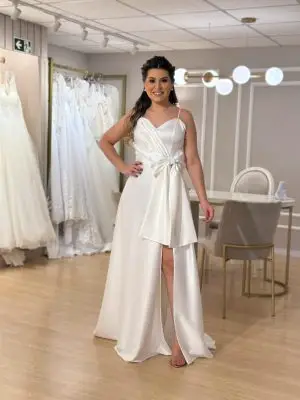 Vestido de noiva fluído, com fenda e laço removível. Belíssima opção, para uma noiva moderna! Na Rose’s Noivas você encontra … Read More