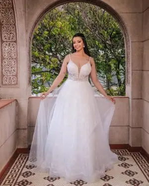 Em tom marfim … com corset estruturado, bordados delicados e mangas removíveis em tule ilusion. Elegante e romântico !
