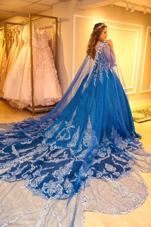 Vestido deslumbrante, azul, com capa curta e uma belíssima capa longa. Incrível para a festa, de uma verdadeira princesa, inspirada … Read More