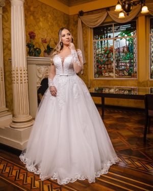 Vestido de noiva princesa, manga longa, com cinto em pedraria. Opção delicada, para uma noiva clássica! Na Rose’s Noivas você … Read More