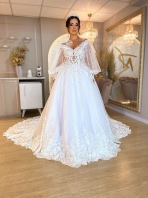 Vestido de noiva princesa, com mangas bufantes removíveis e cauda. Na Rose’s Noivas você encontra essa e outras opções de … Read More