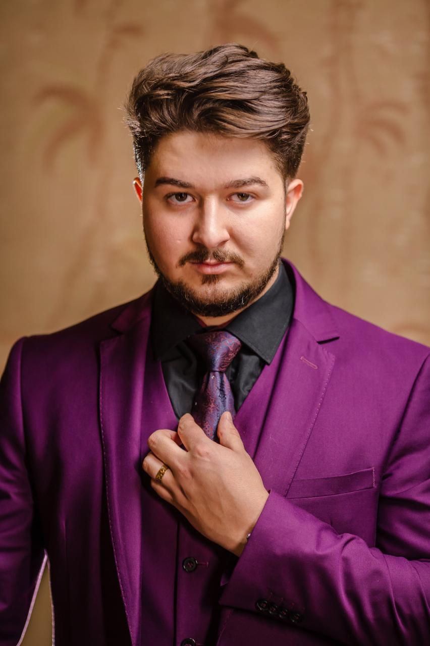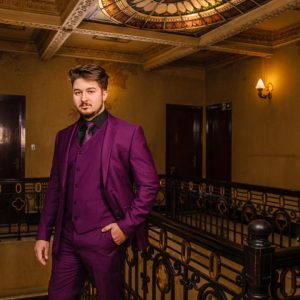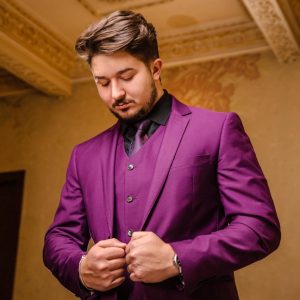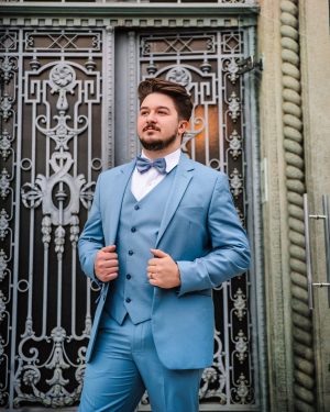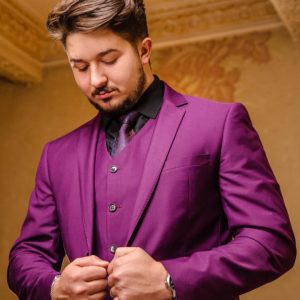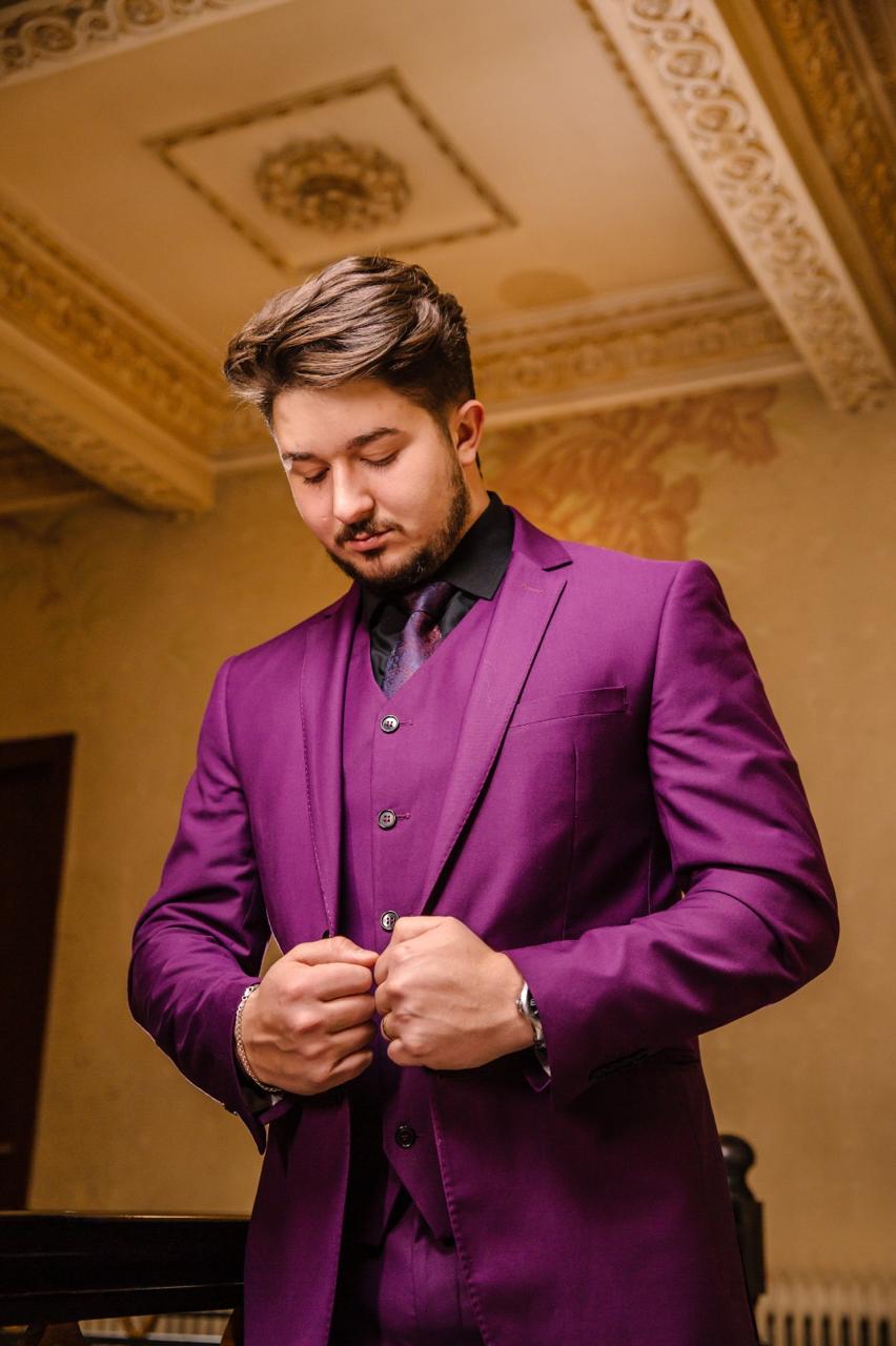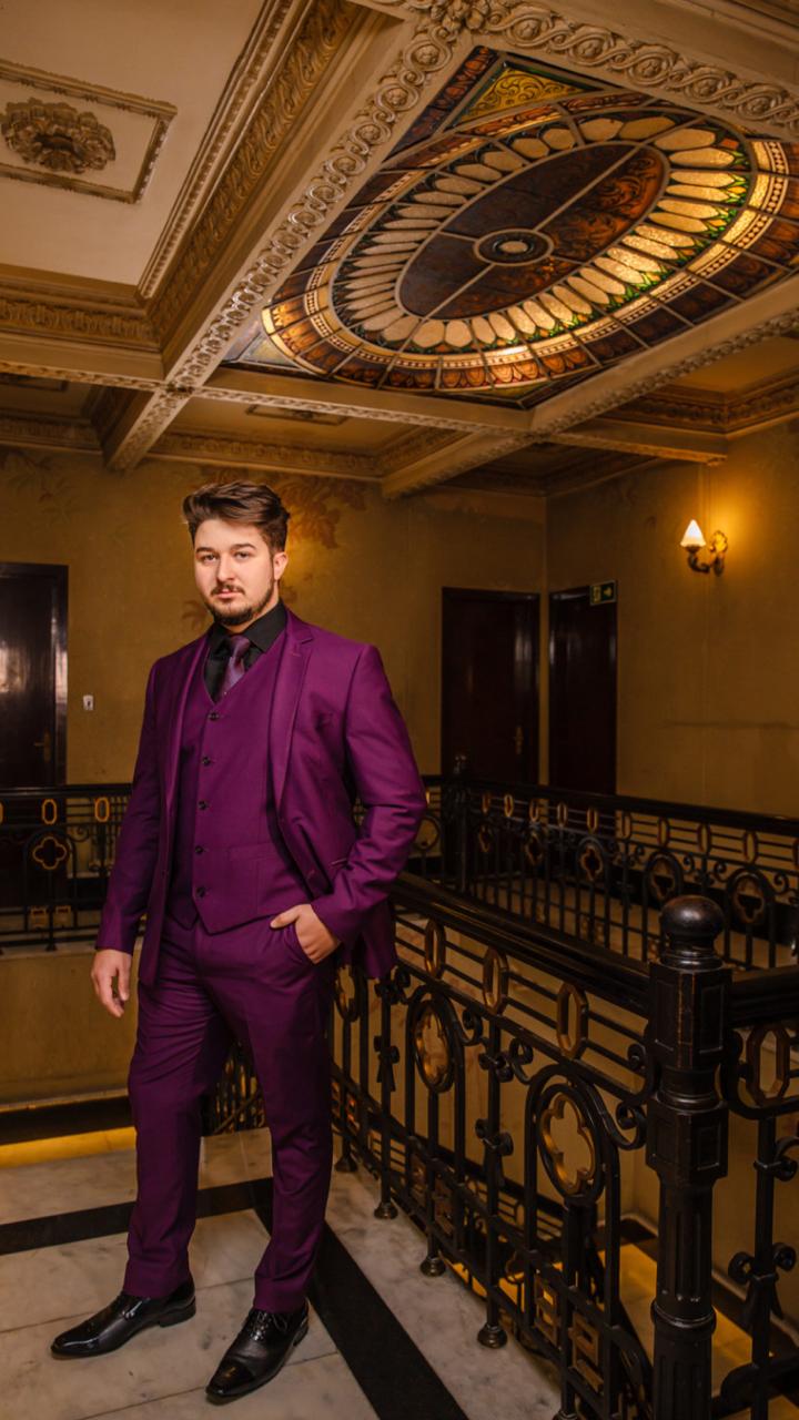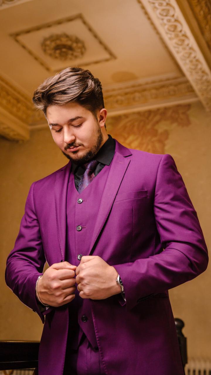 Terno composto com três peças: paletó, colete e calça, confeccionado em poliéster e viscose e elastano, levando o selo “Technical Perfomance Stretch” por possuir elastano em sua composição, garantindo assim maior conforto e flexibilidade. O paletó possui dois botões no tom de acordo com o tecido e duas aberturas. O acabamento interno leva ponto picado de 2mm na cor lilás, forro jacquard no tom e mangas no forro listrado. O colete possui ponto picado externo e costas com forro jacquard e fivela metálica. A calça leva ajuste na lateral  com colchetes interno e ajuste lateral com fivelas, possibilitando aumentar o diminuir em até um número.  A modelagem Super Slim Fit desenvolvida especialmente para homens que gostam de peças mais ajustadas e com excelente caimento.