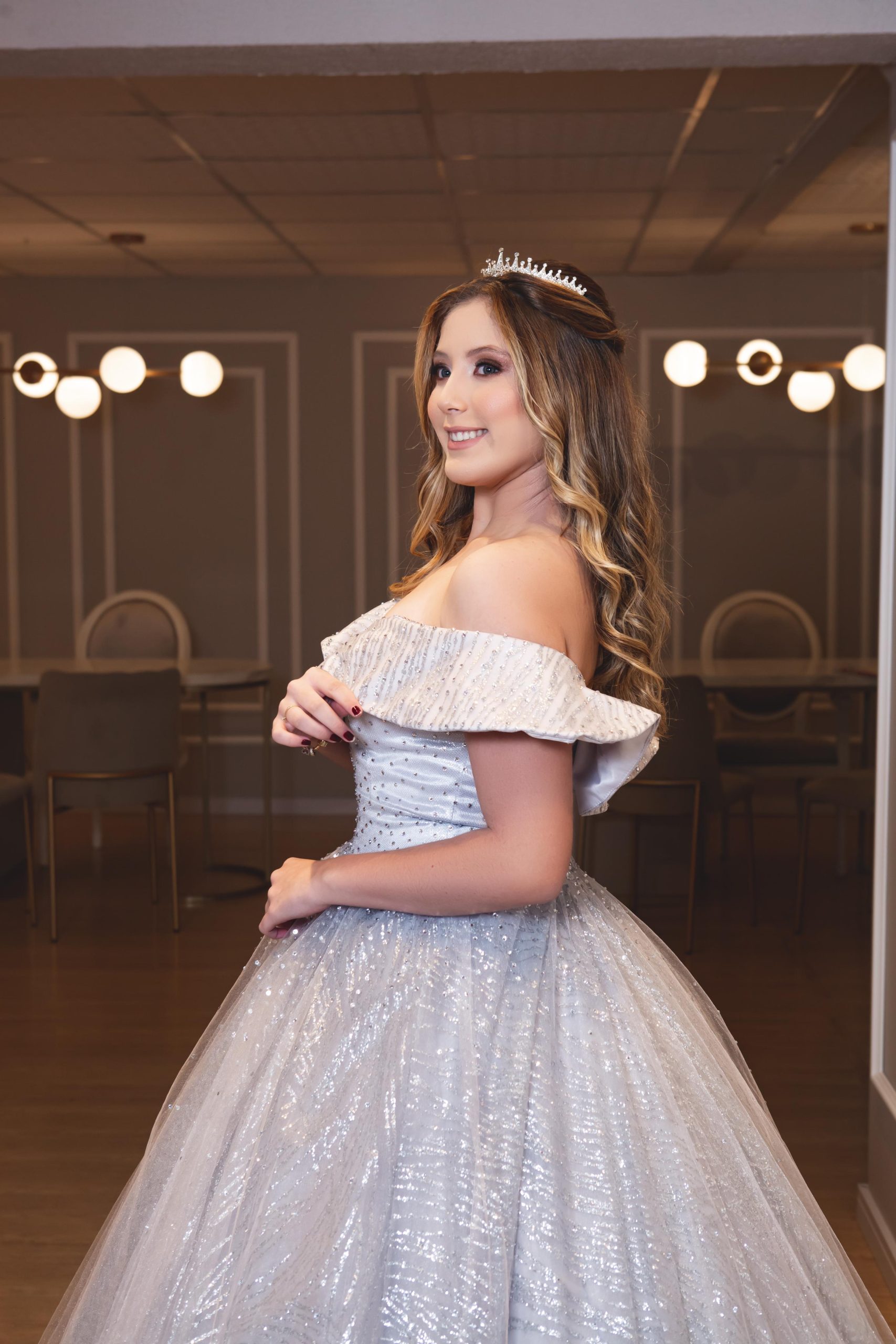 Vestido de debutante, na cor prata, com muito brilho! Digno de uma verdadeira princesa que busca brilhar muito na sua festa, com um vestido moderno!