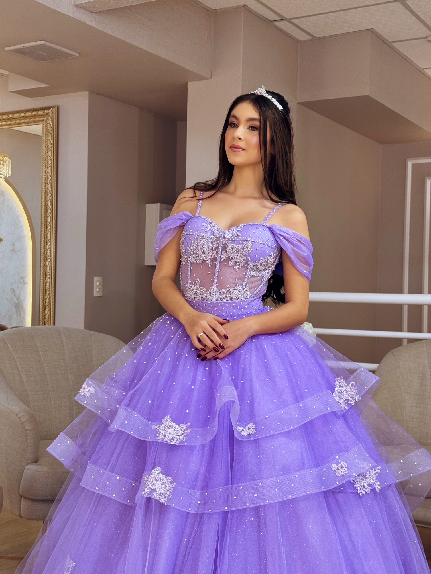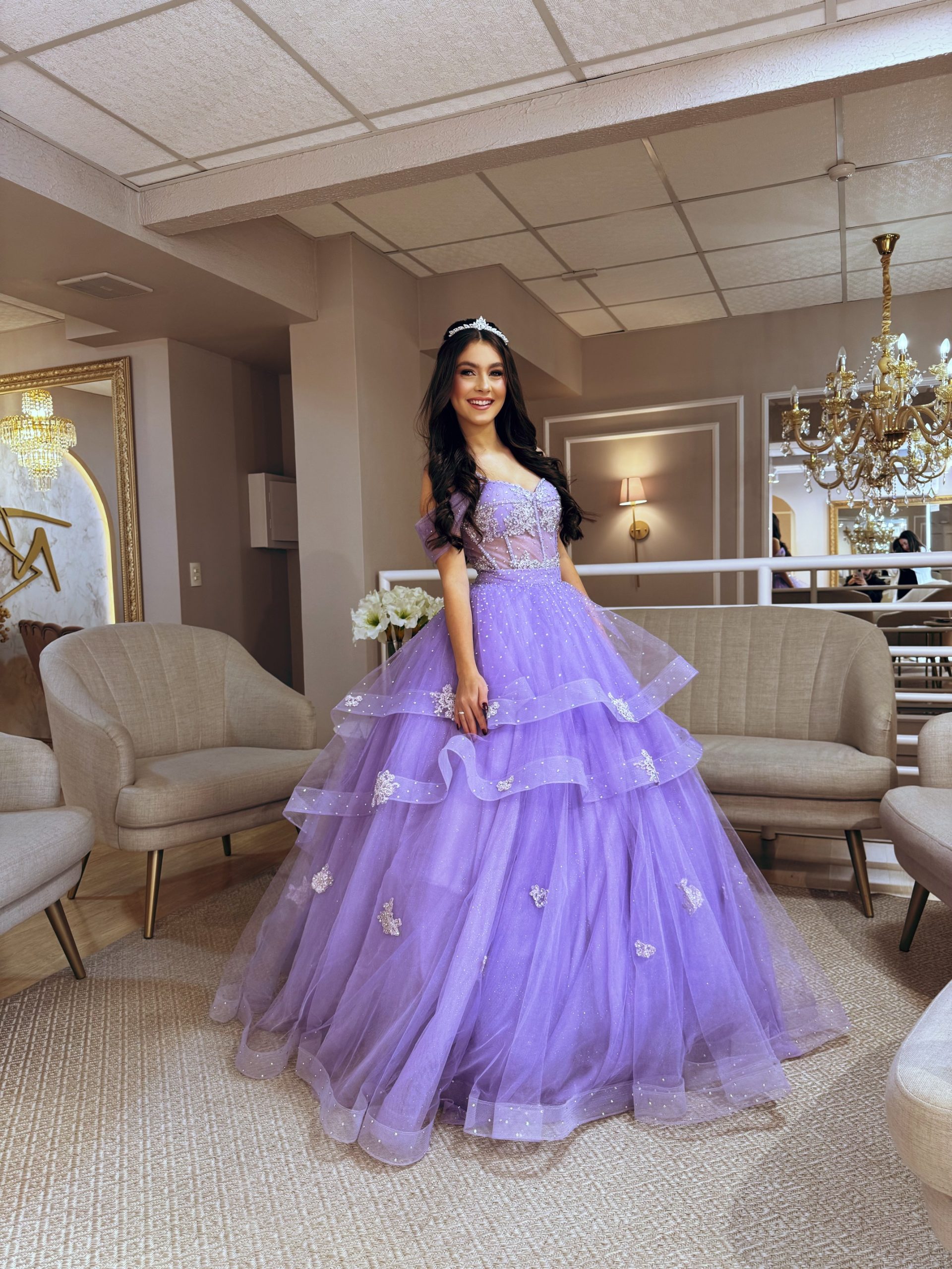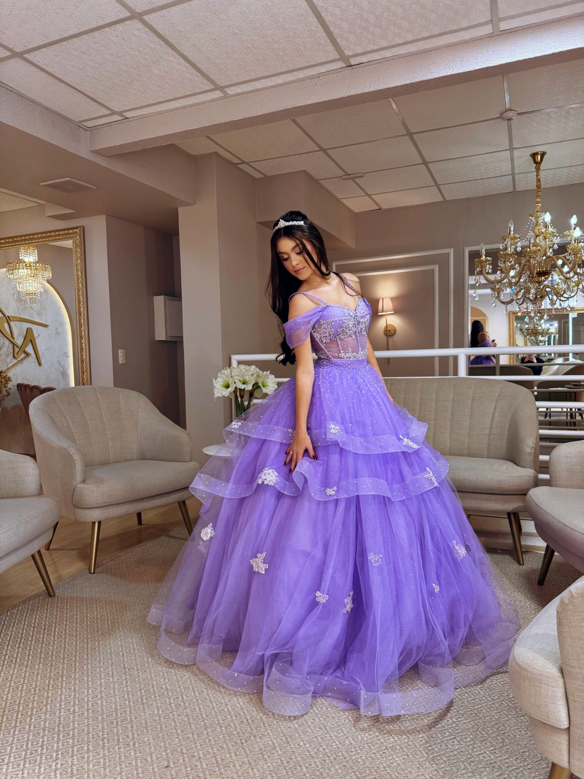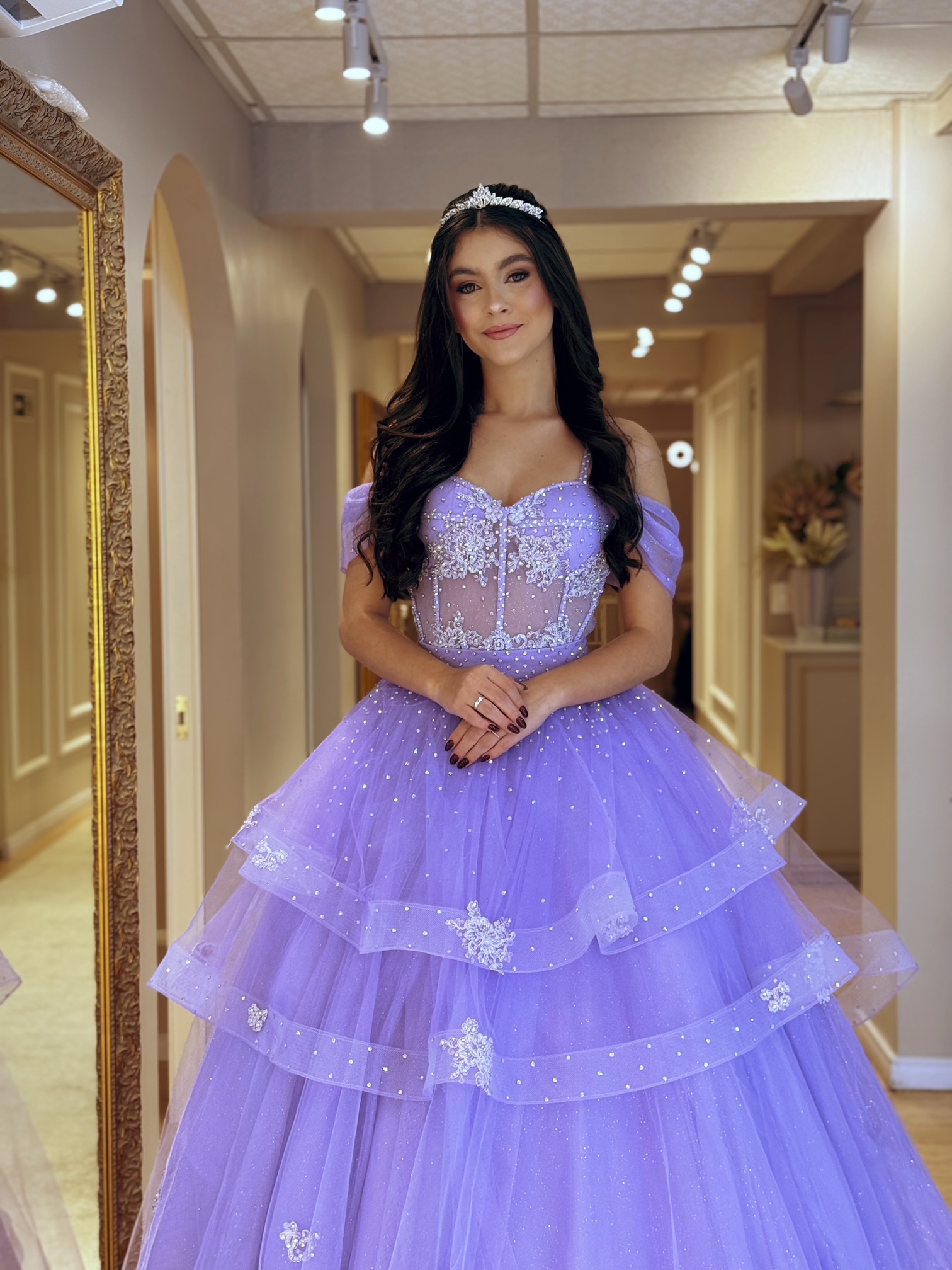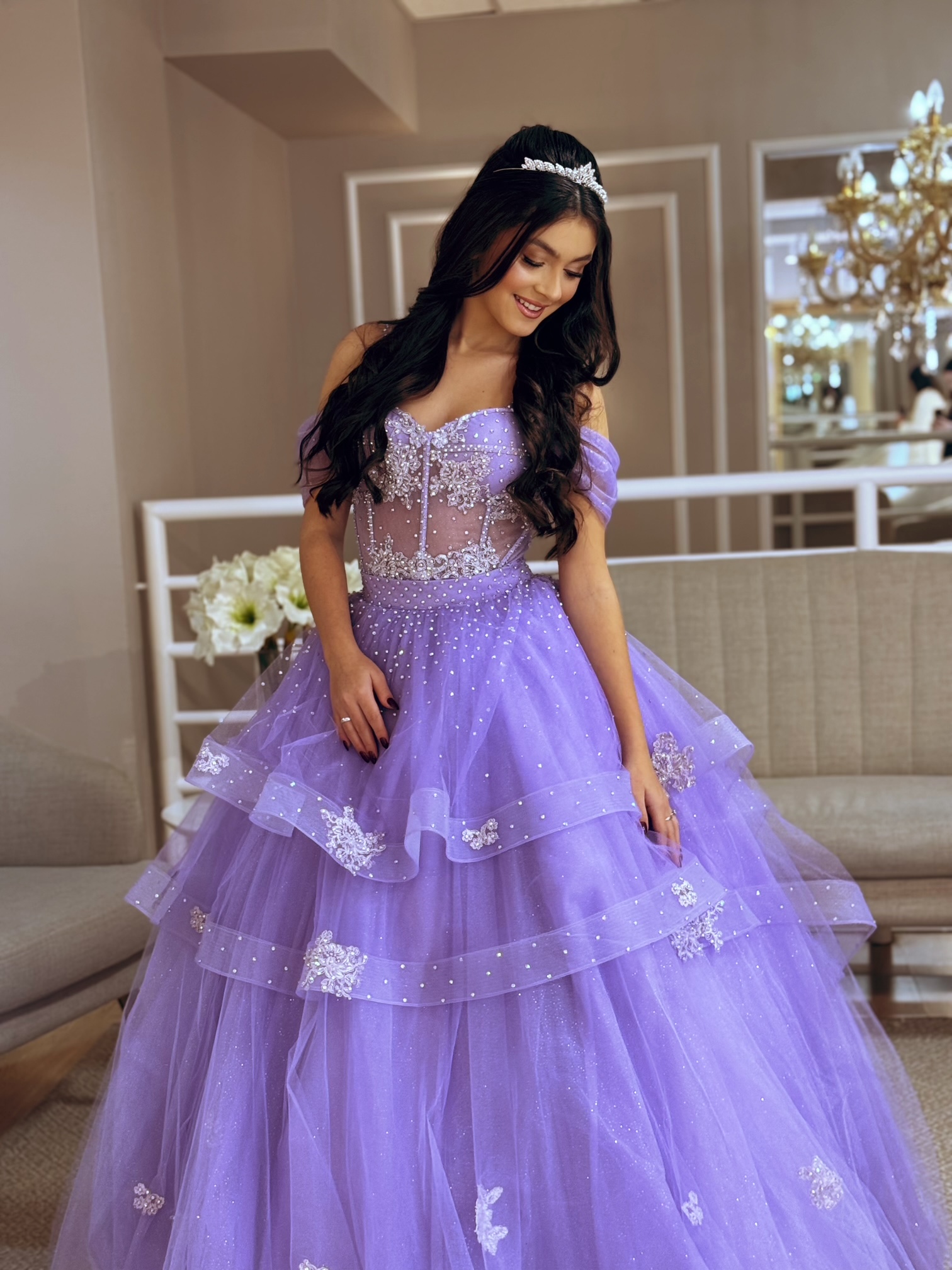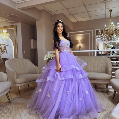 Doce como lavanda, forte como um sonho… com tule estruturado vem com bordados e aplicações enquanto suas camadas revelam toda sua magia.