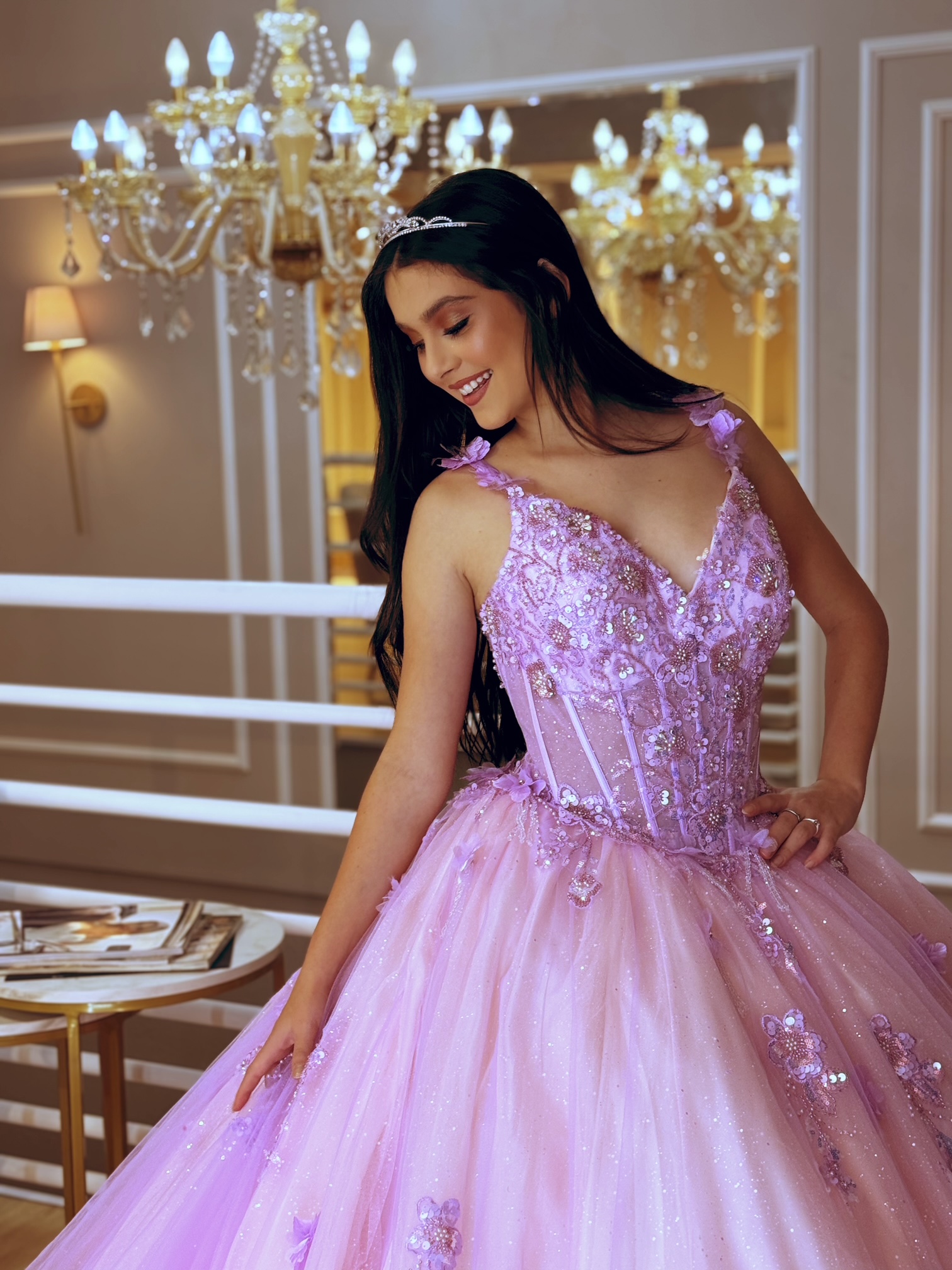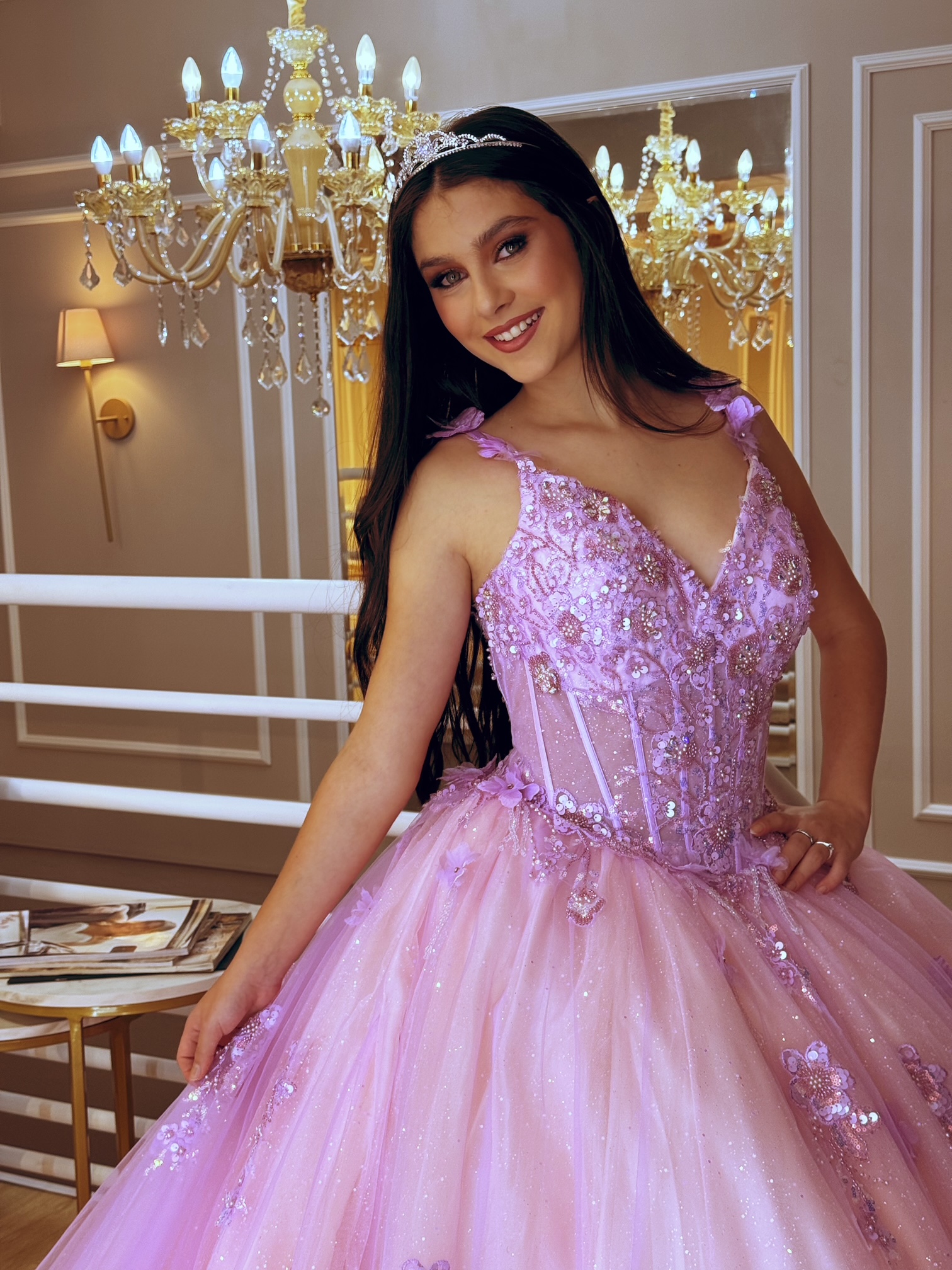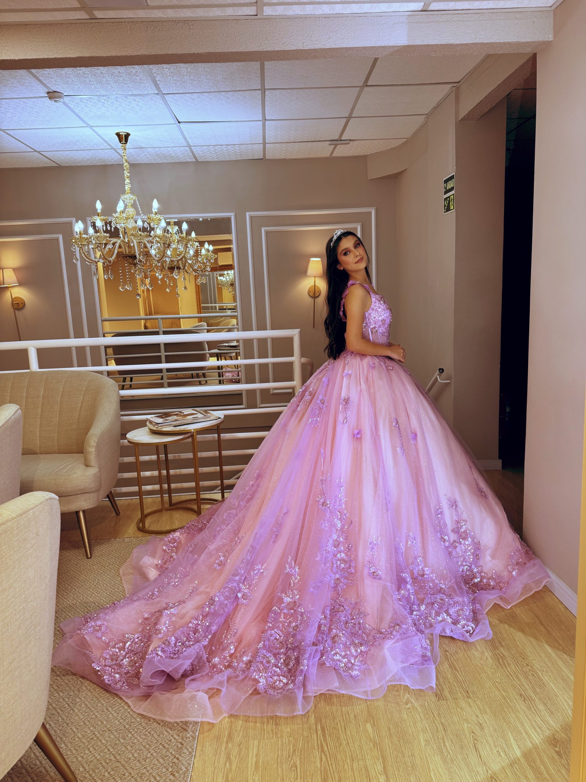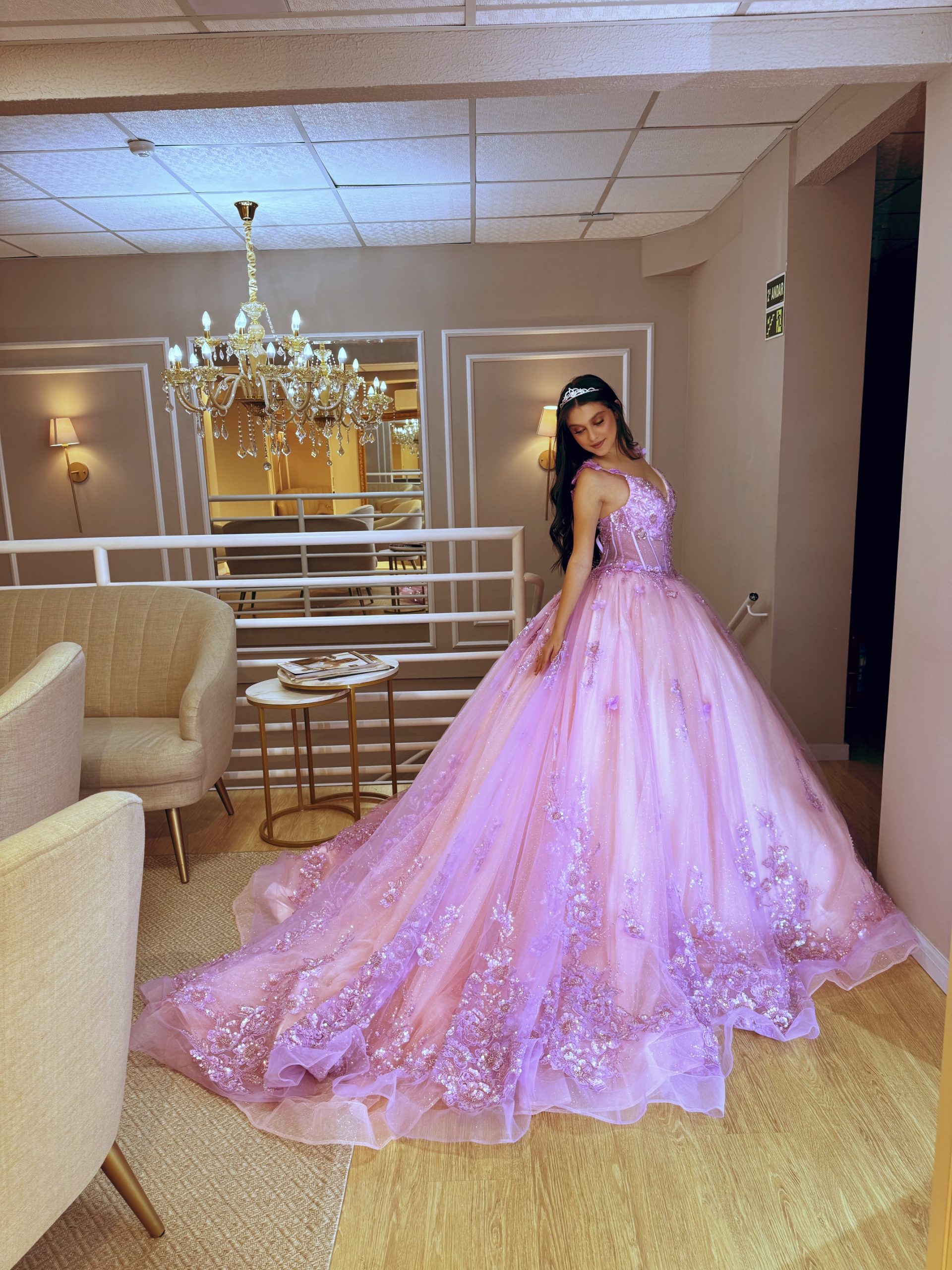 Vestido de debutante Rosa/Lavanda com aplicações e bordados , seus tons holográficos mudam de acordo com a iluminação.