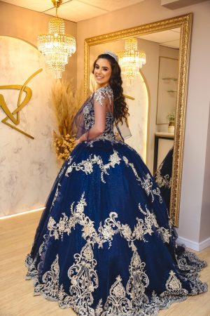 Lindo vestido de debutante Safira, da coleção Encantada. Um vestido azul royal ombro a ombro, com aplicações em bordado dourado … Read More