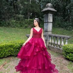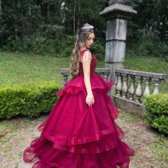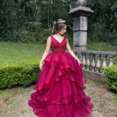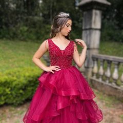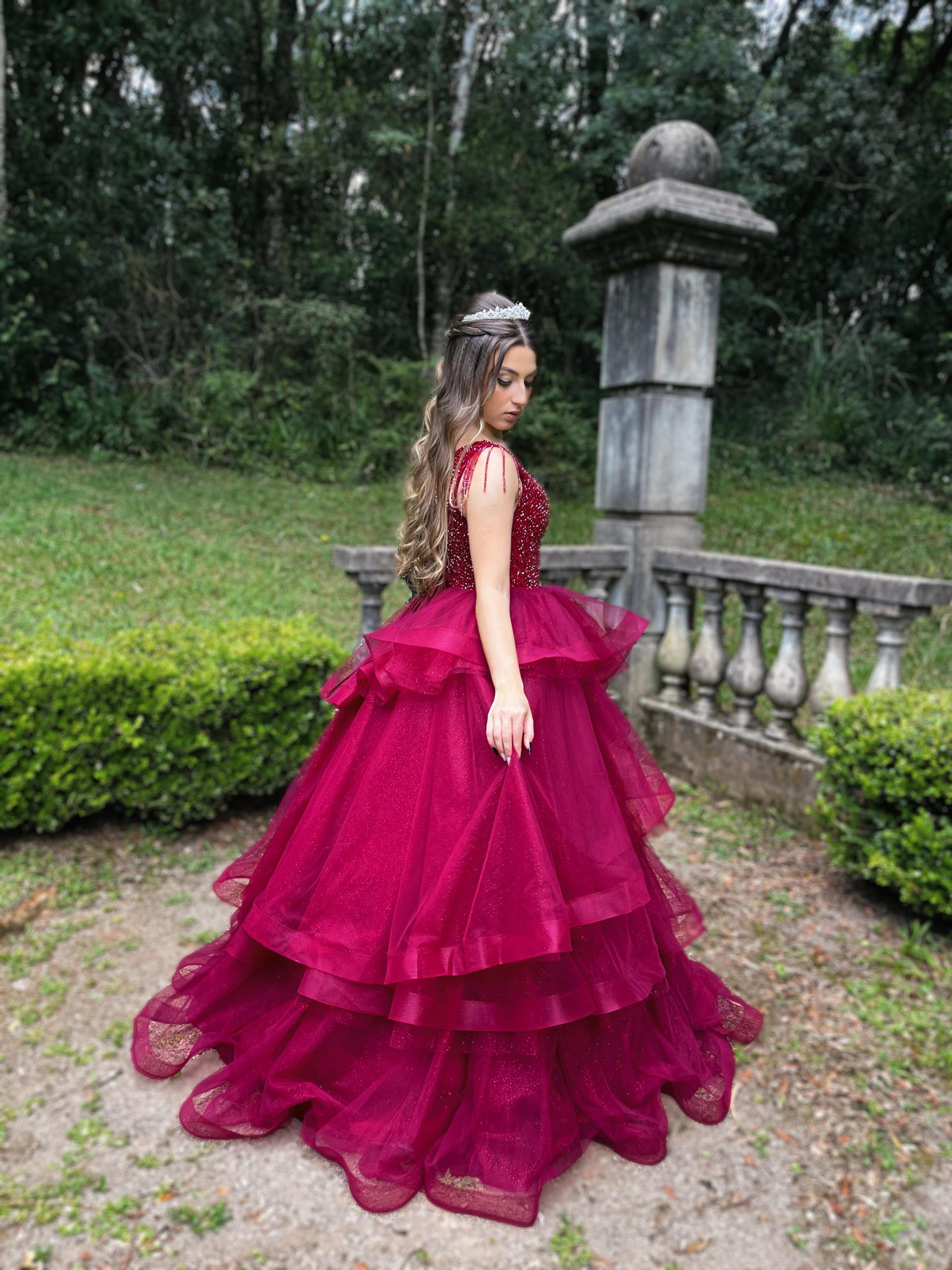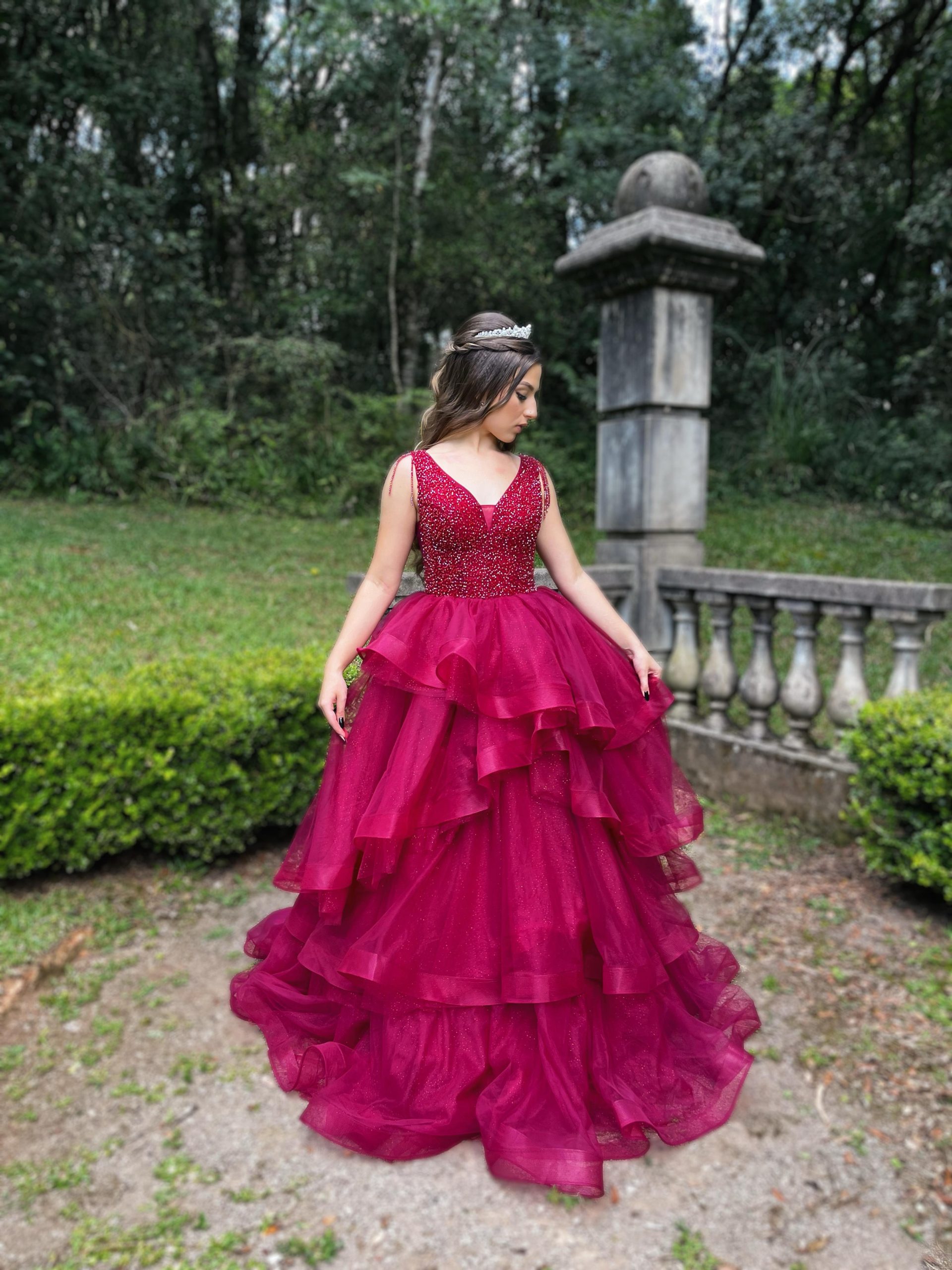 Vestido de debutante marsala com a saia em babados e corpo com brilho para trazer sofisticação para a sua festa de 15 anos.