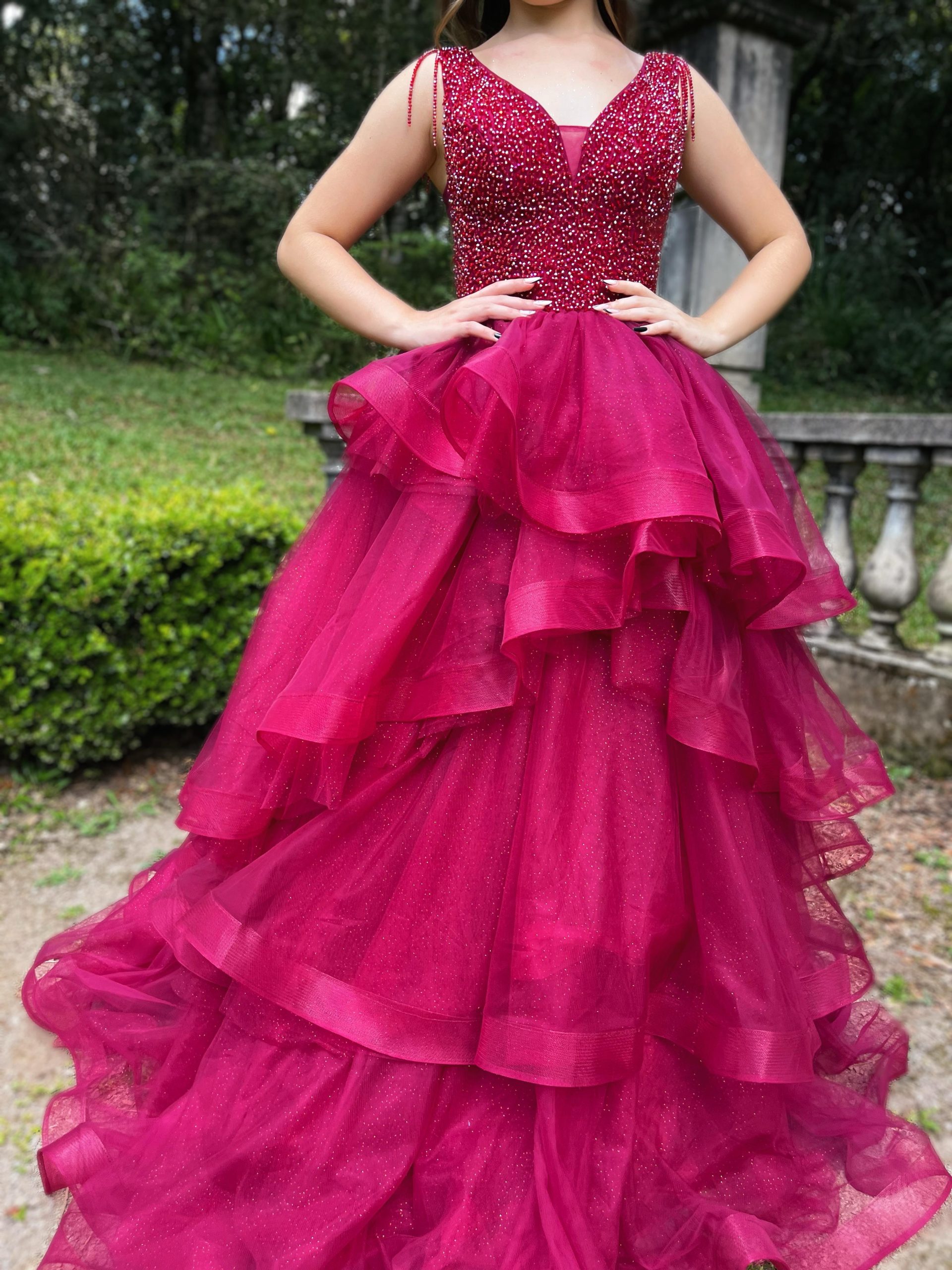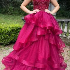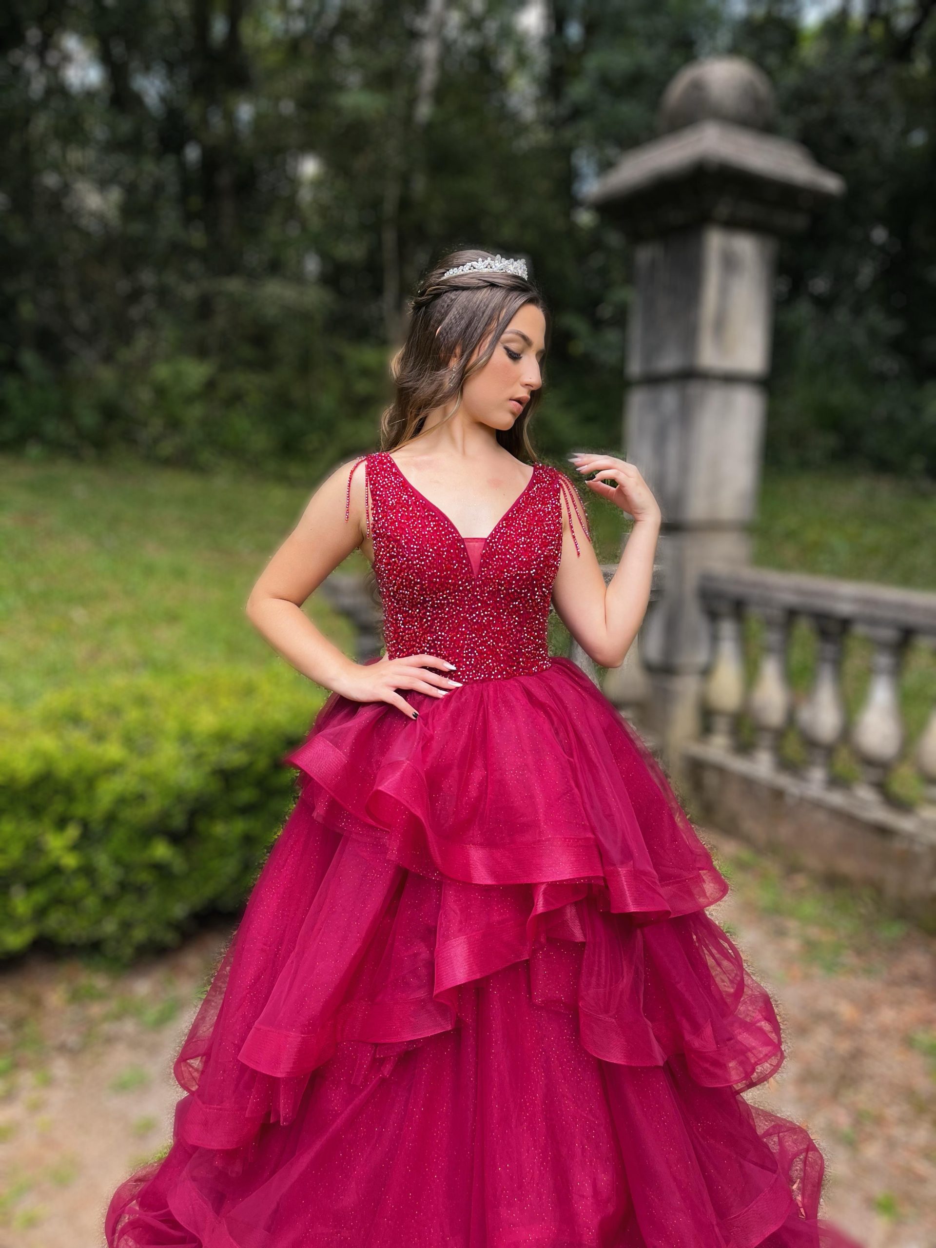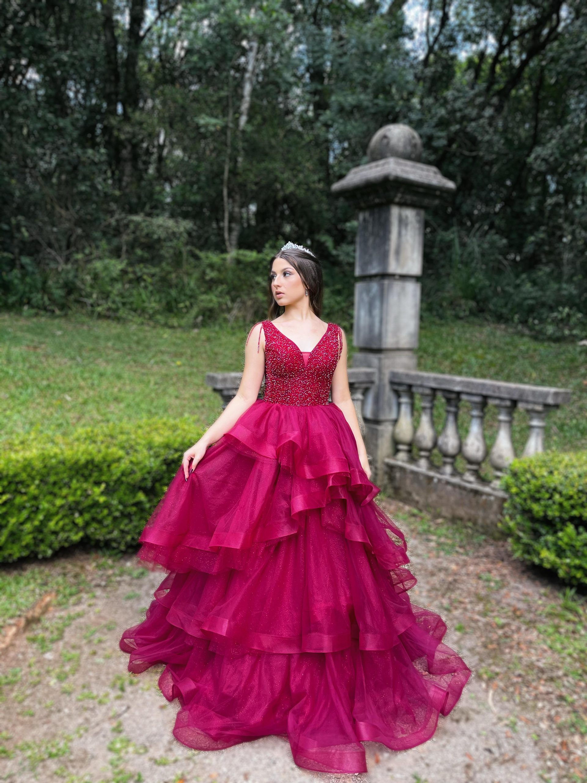 Vestido de debutante marsala com a saia em babados e corpo com brilho para trazer sofisticação para a sua festa de 15 anos.