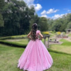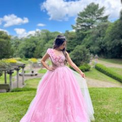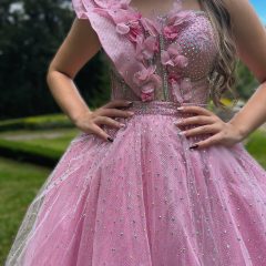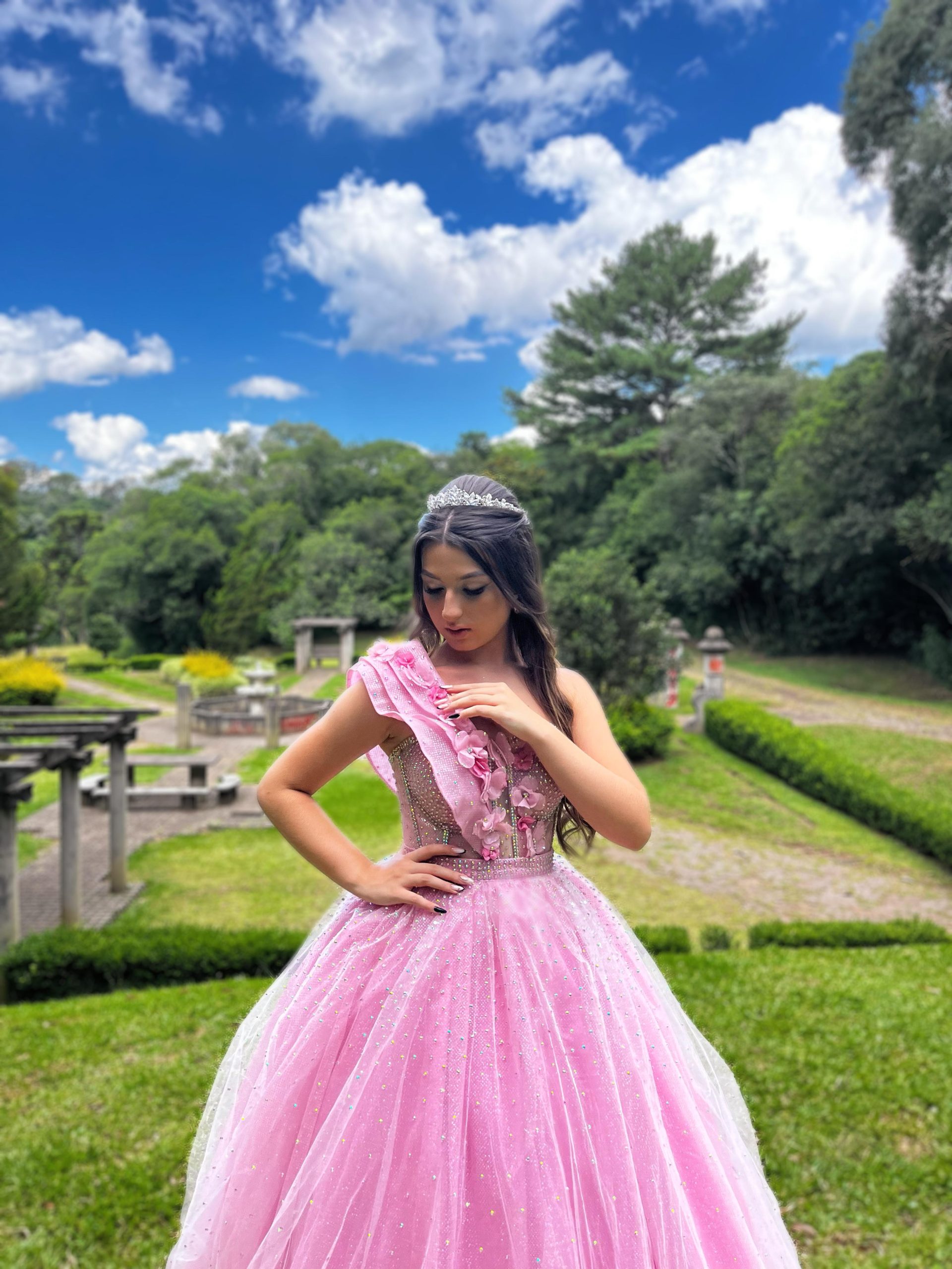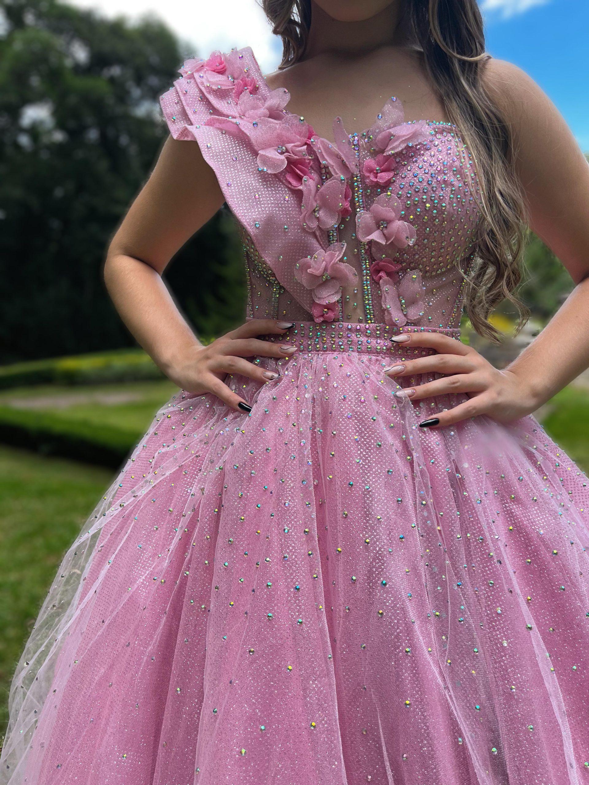 Vestido de debutante da Coleção Fadas. Rosa com pedrarias por todo o vestido e flores aplicadas no topo que garantirá estilo e delicadeza para a sua festa de 15 anos.
