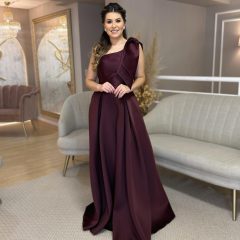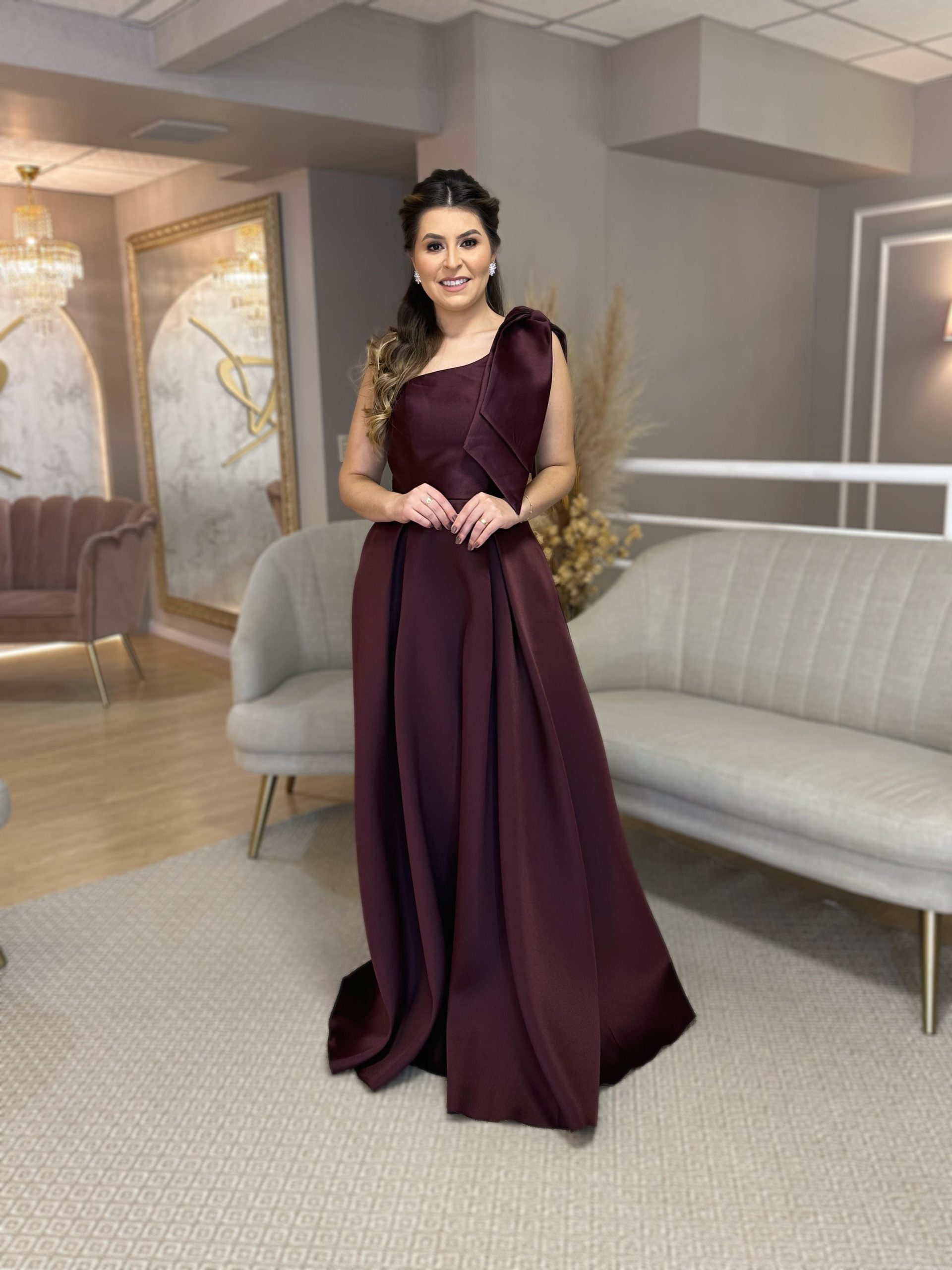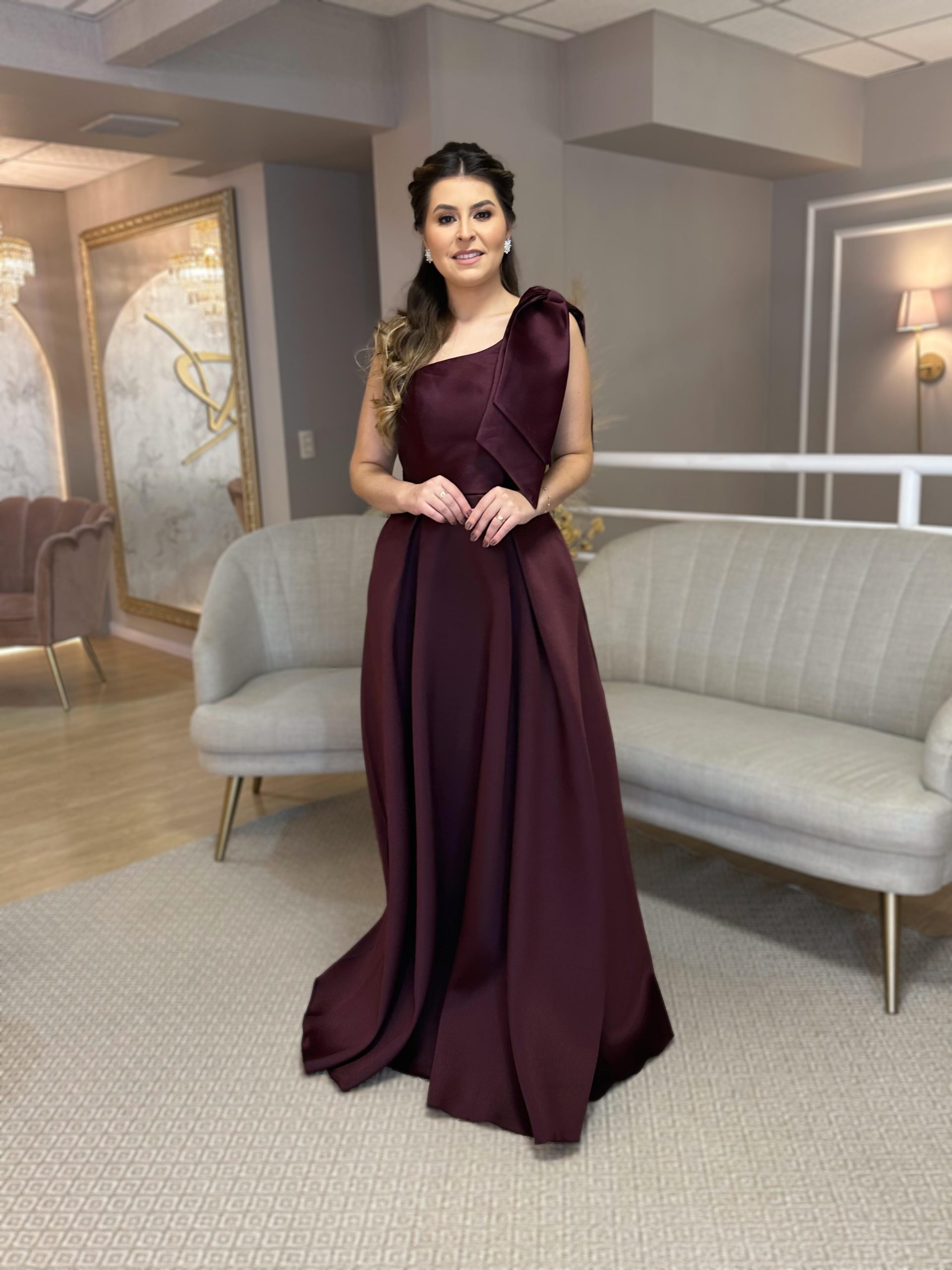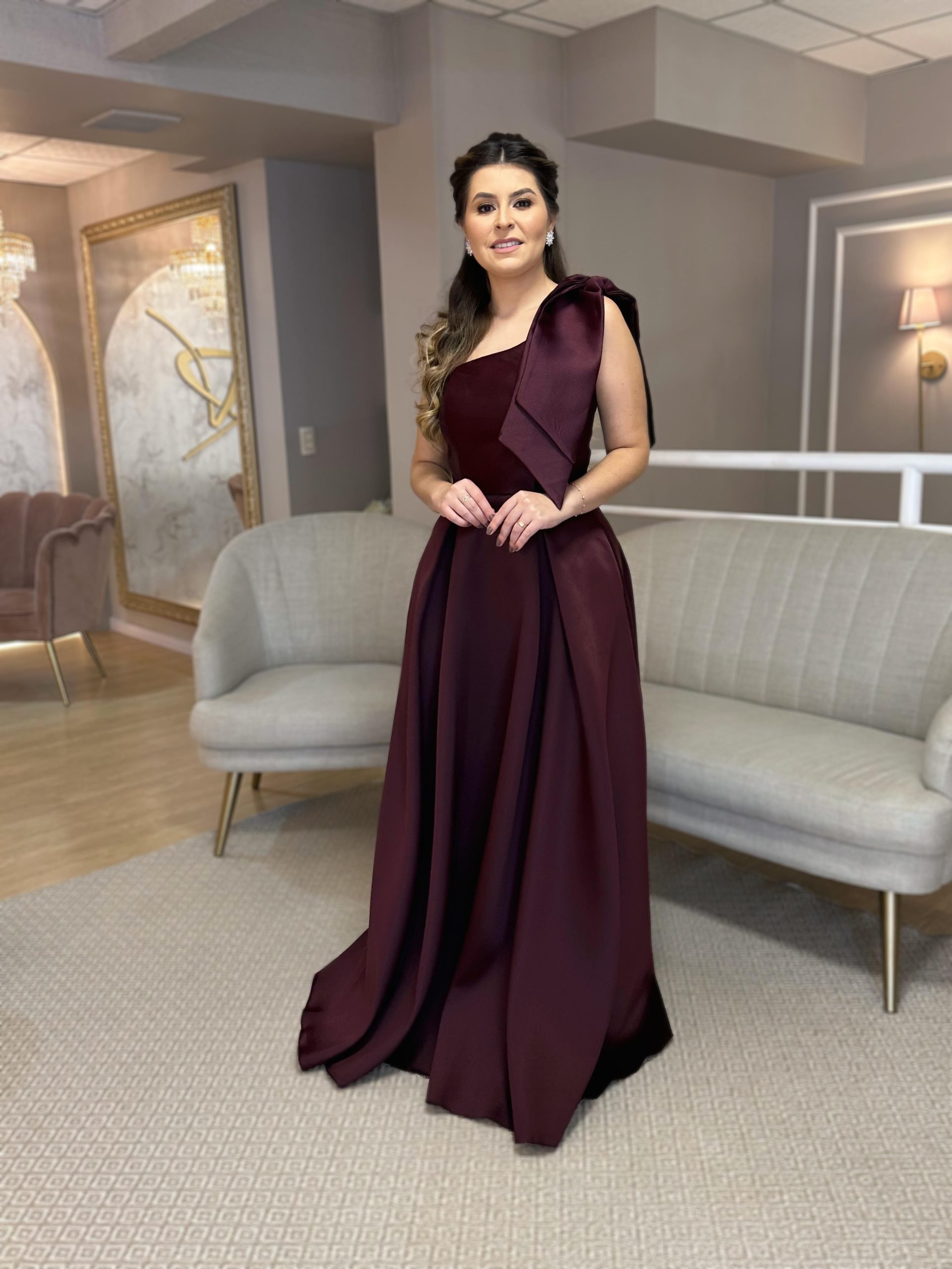 Vestido de zibeline, marsala, um ombro só, com a tendência do laço. Na Rose’s Noivas, você encontra uma ampla variedade de modelos e tamanhos. Agende o seu horário e venha conferir!