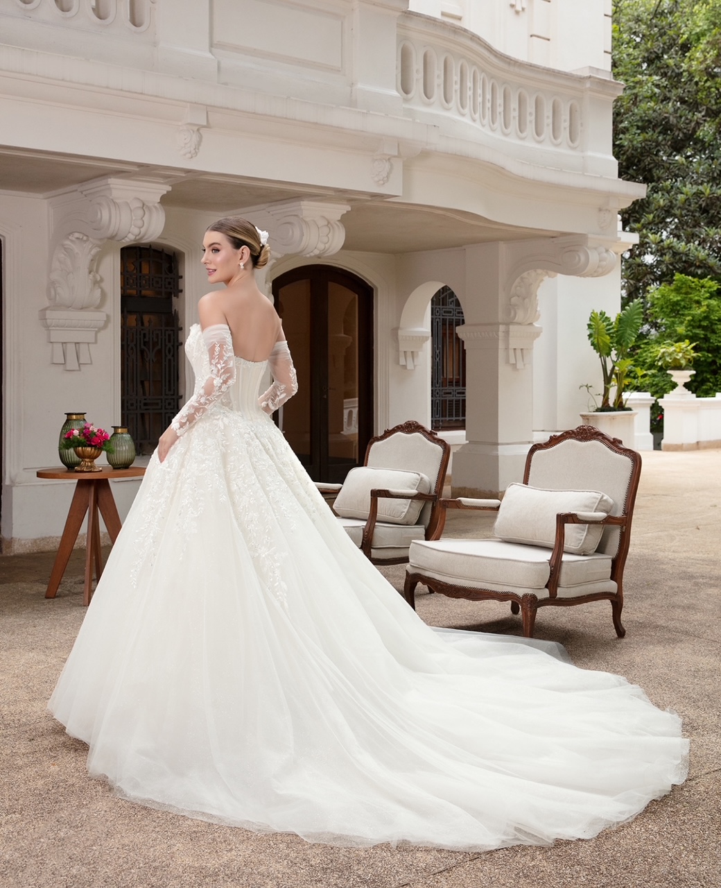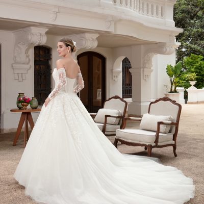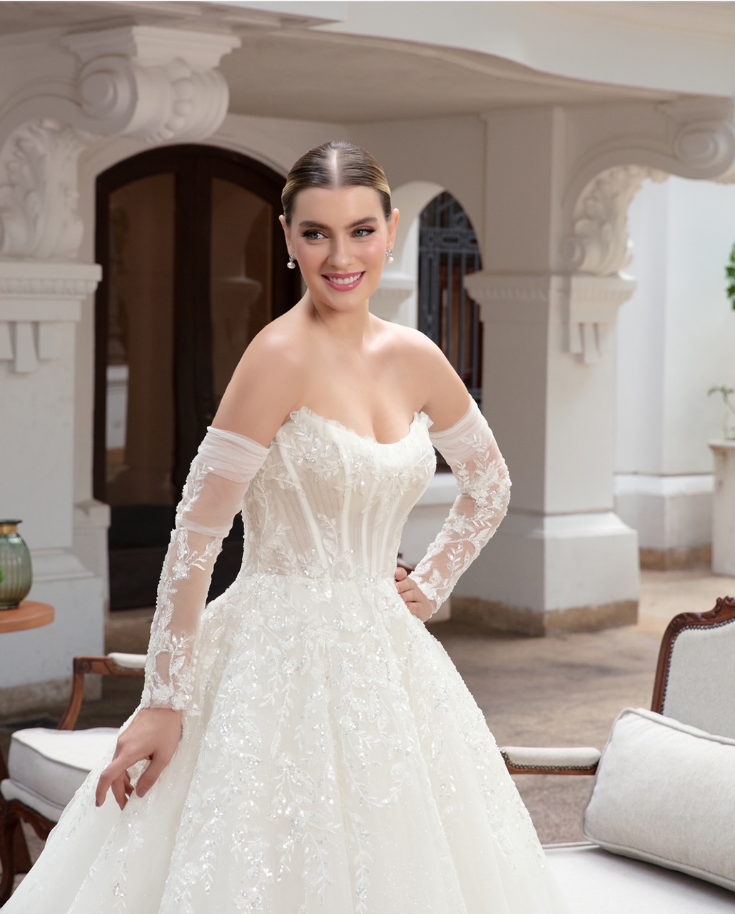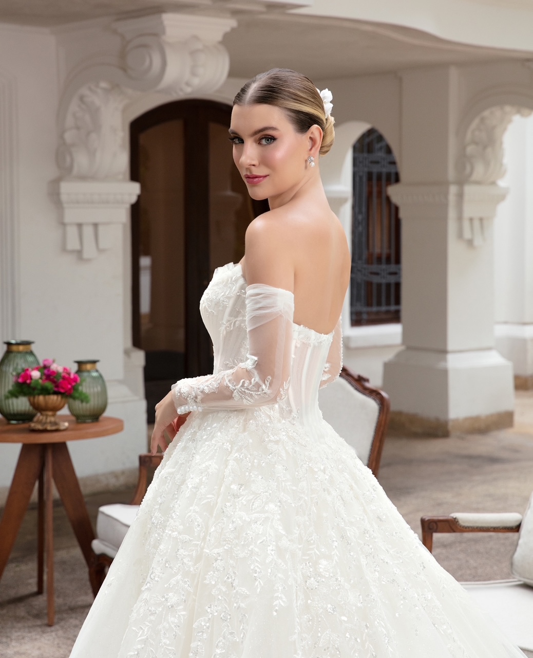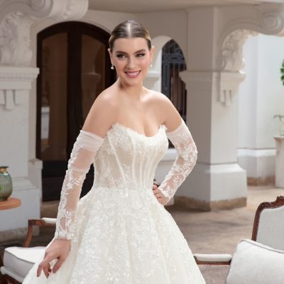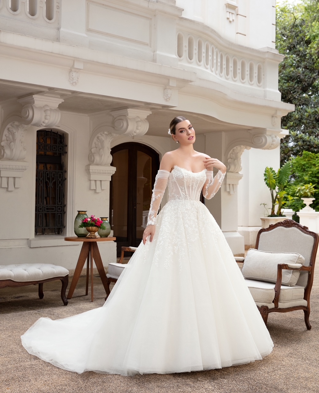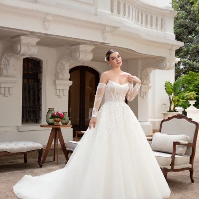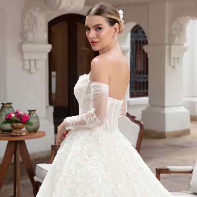Em tom marfim … com corset estruturado, bordados delicados e mangas removíveis em tule ilusion. Elegante e romântico !