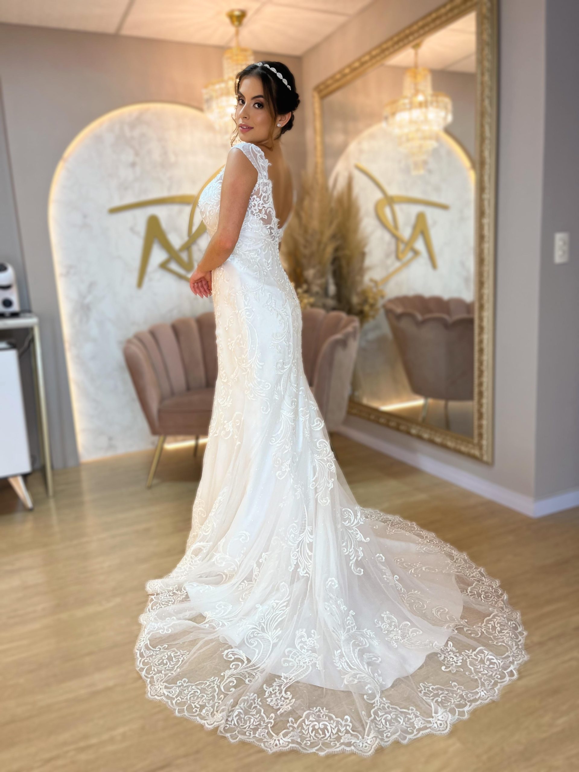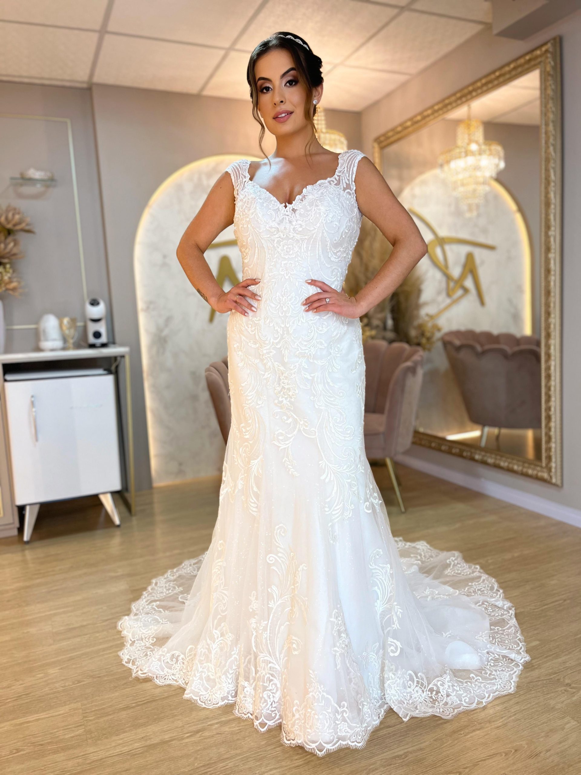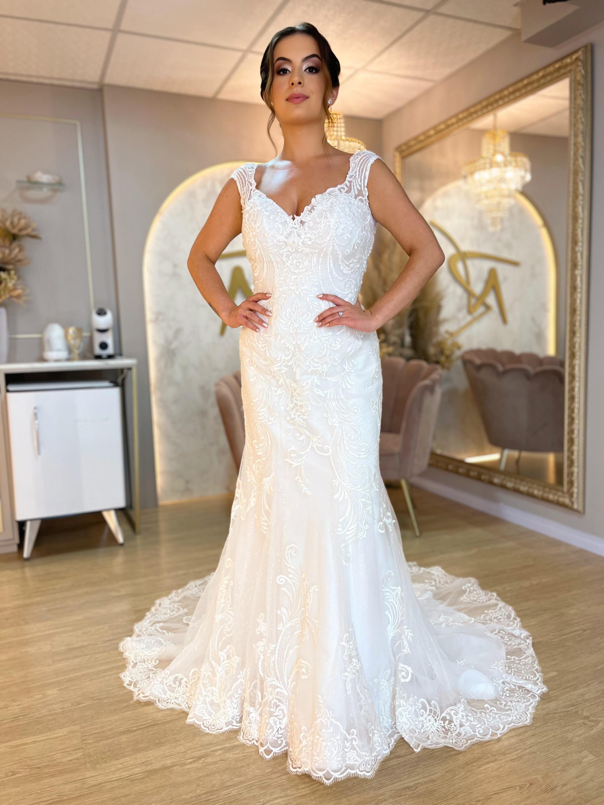 Uma verdadeira obra de arte … design minimalista com aplicações sutis em pérolas, saia princesa … um clássico repaginado.
