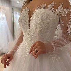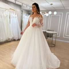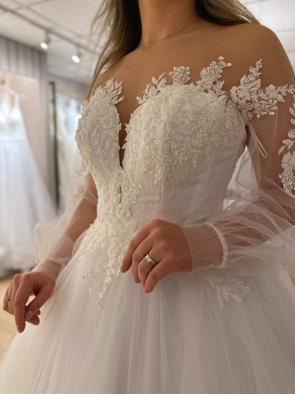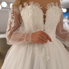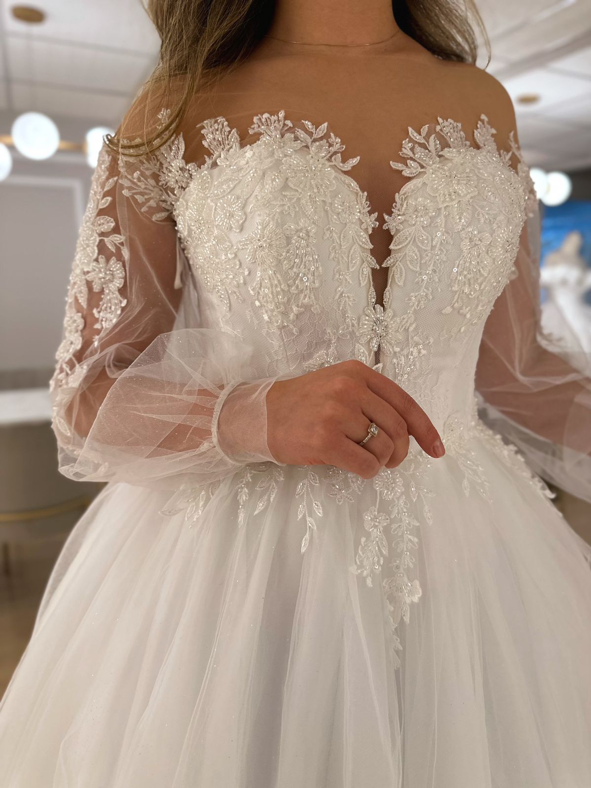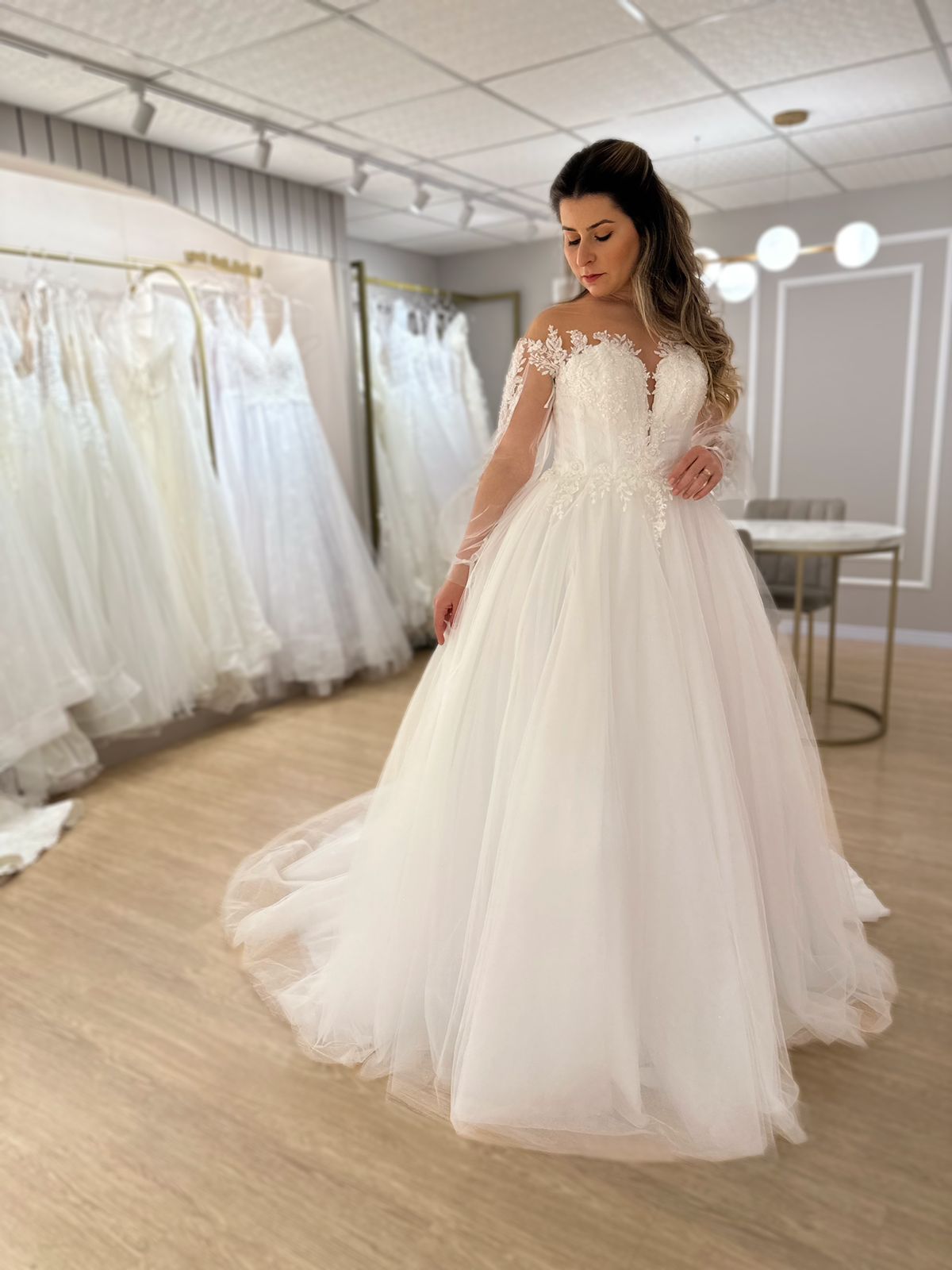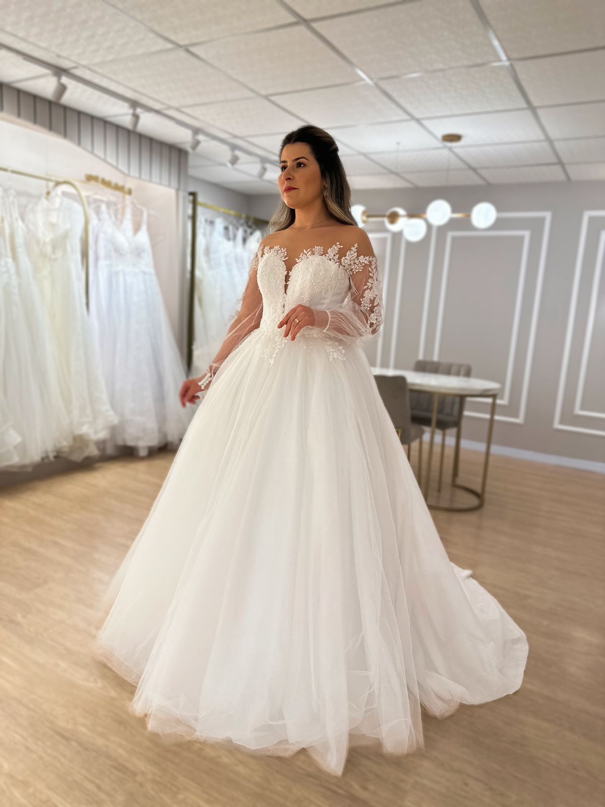 Vestido de noiva princesa, manga longa, corpo bordado e saia de tule. Na Rose’s Noivas você encontra essa e outras opções de vestido de noiva.