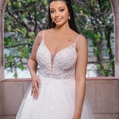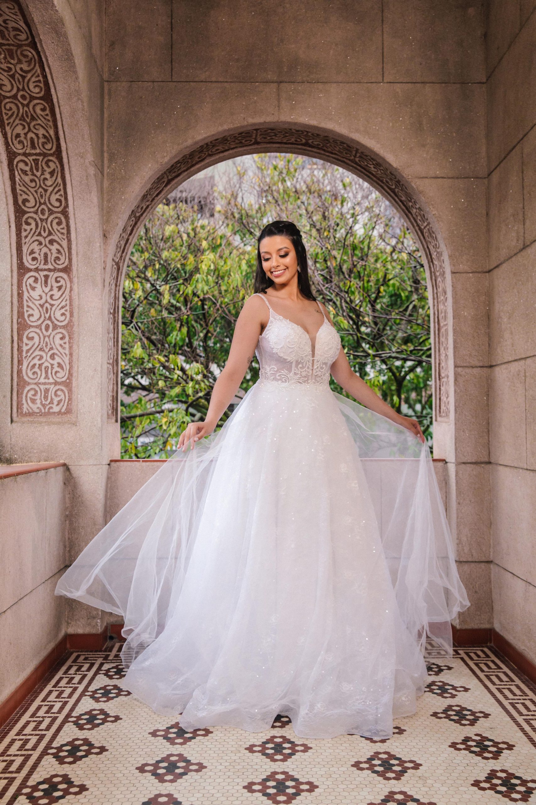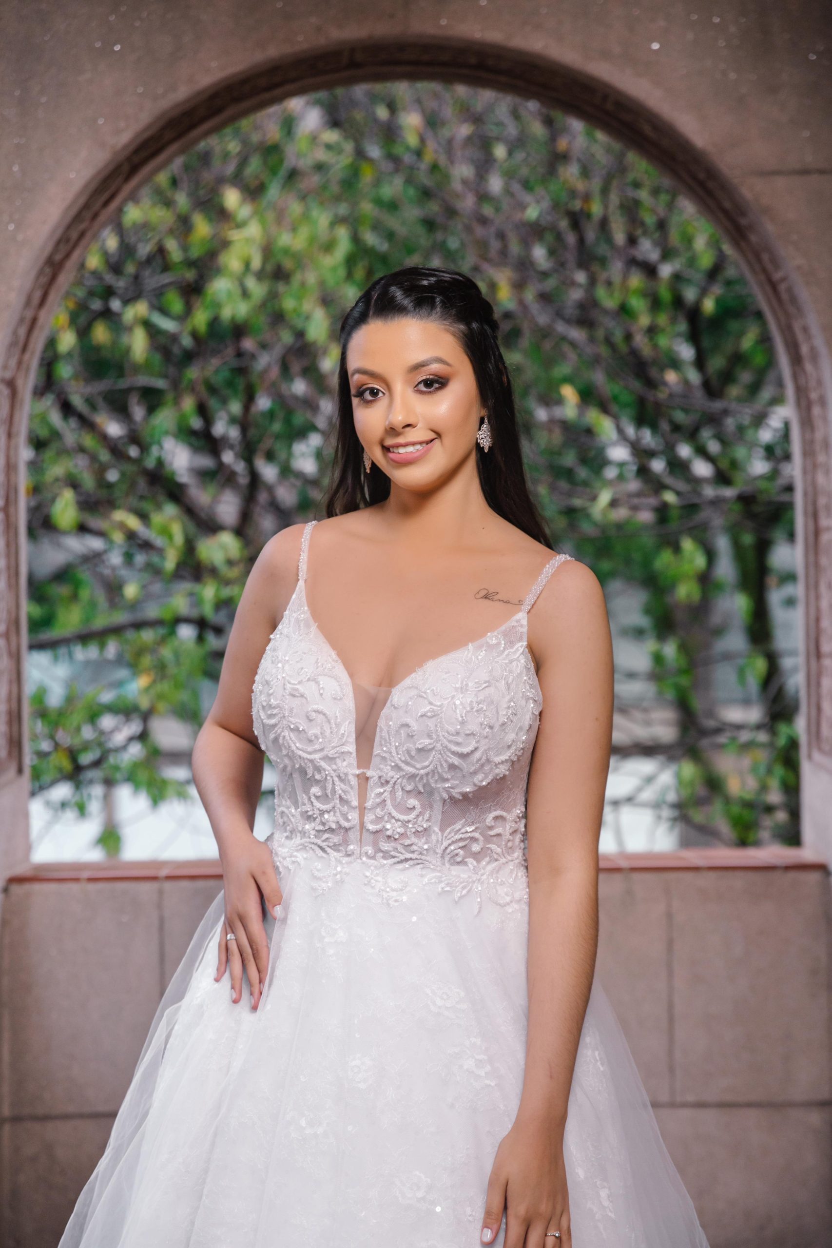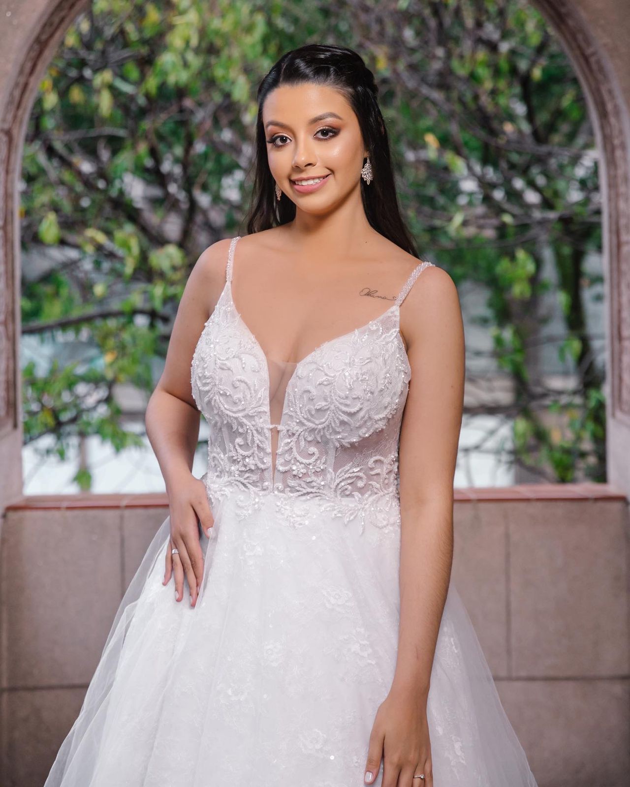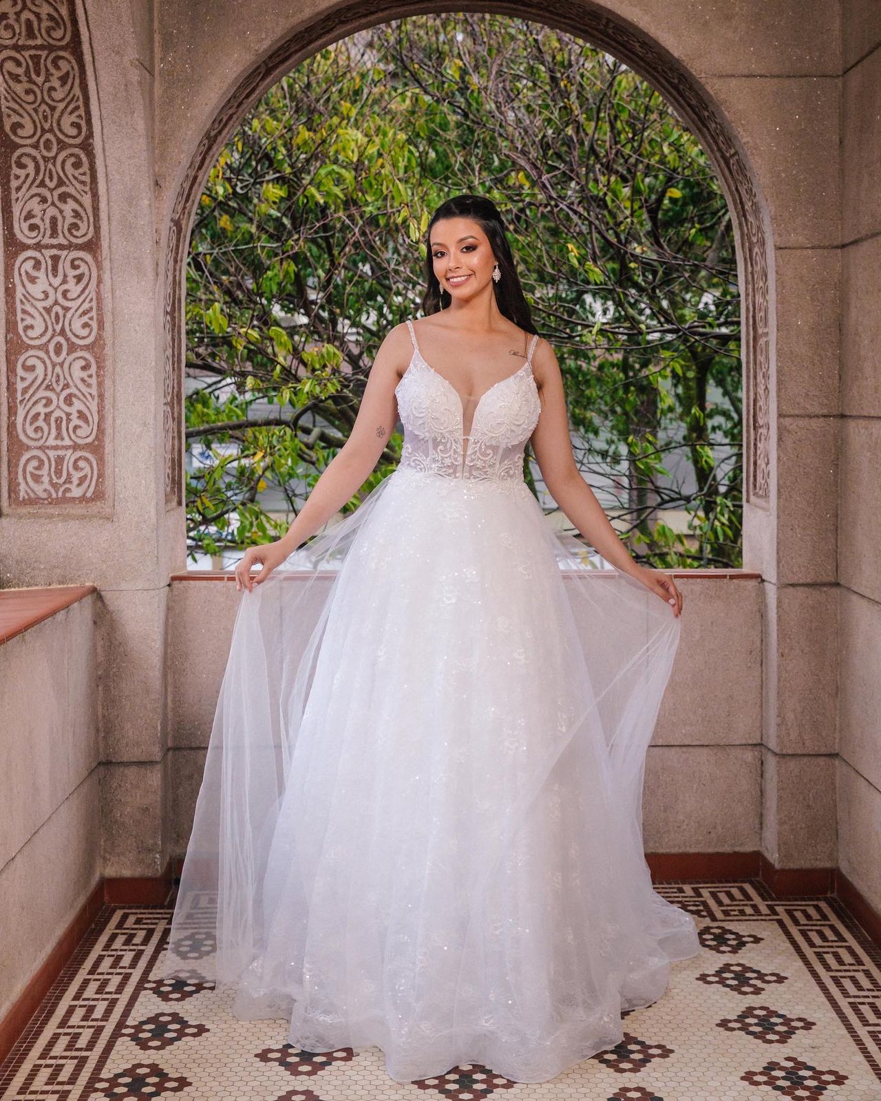 Vestido de noiva princesa com transparência, saia em renda e tule, corpo bordado com delicados cristais. Na Rose’s Noivas você encontra essa e outras opções de vestido de noiva.