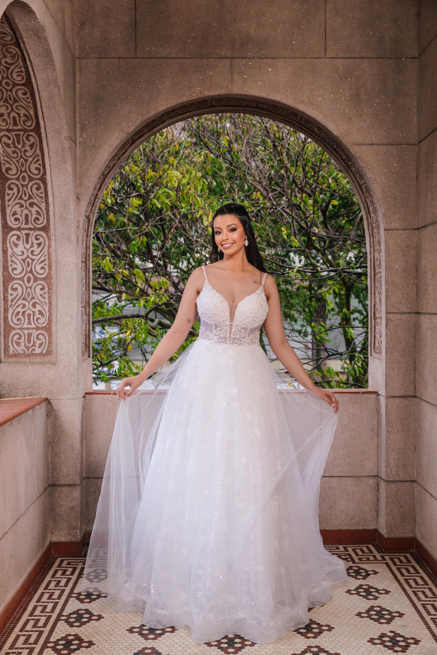 Vestido de noiva princesa, com mangas bufantes removíveis e cauda. Na Rose’s Noivas você encontra essa e outras opções de … Read More