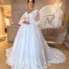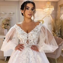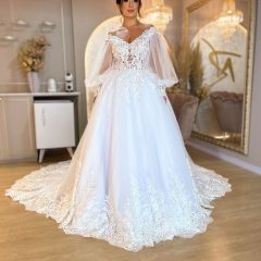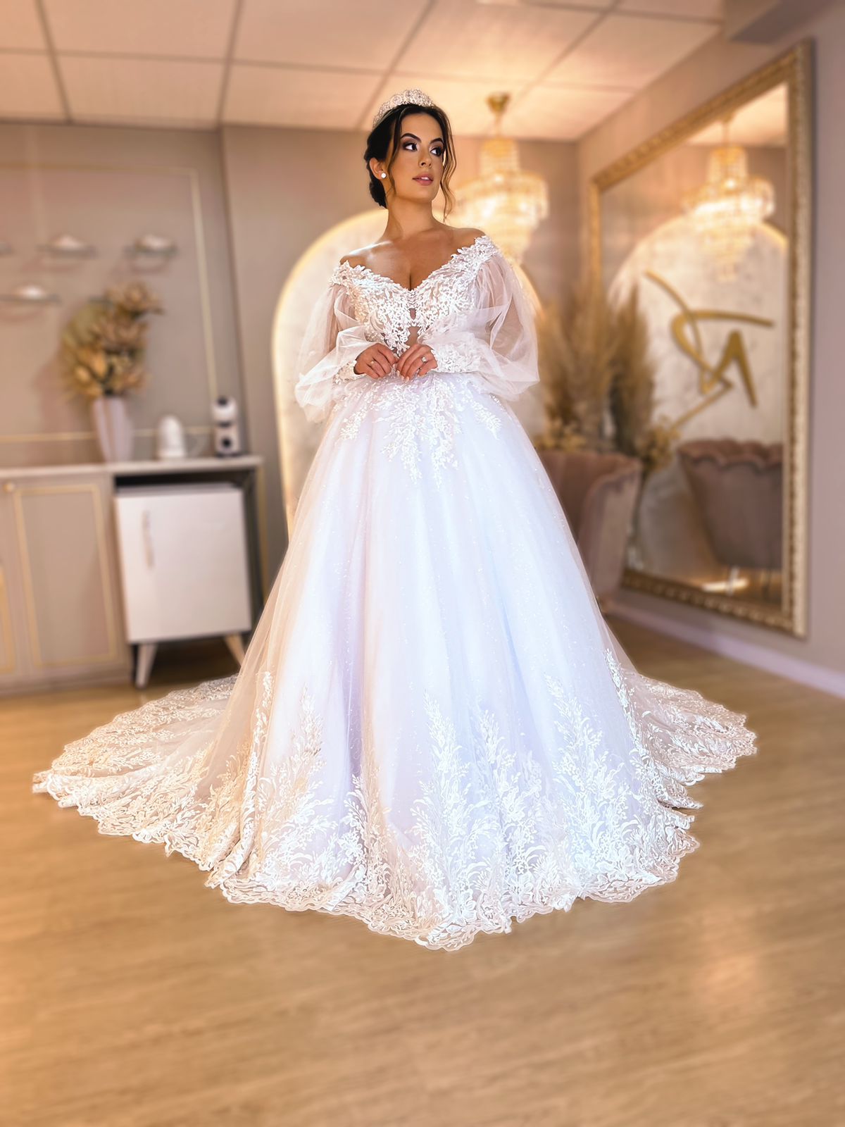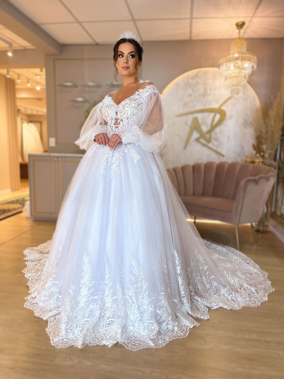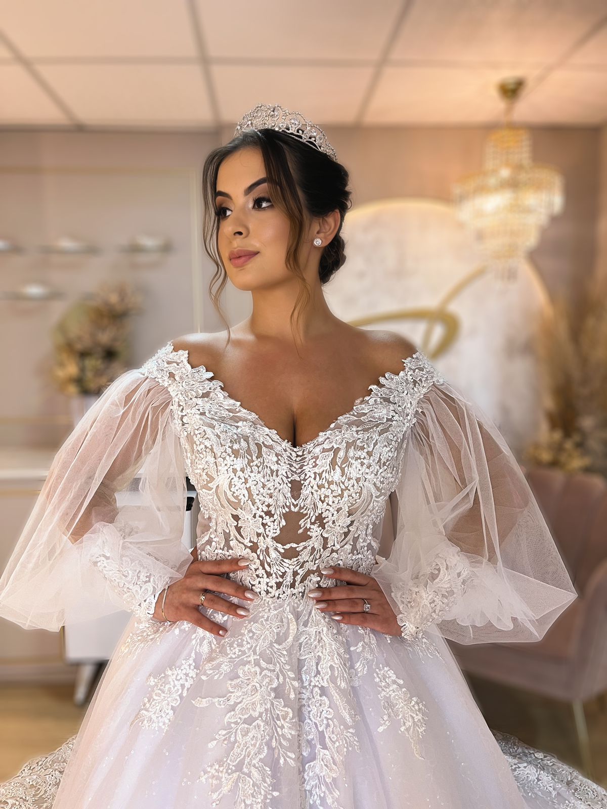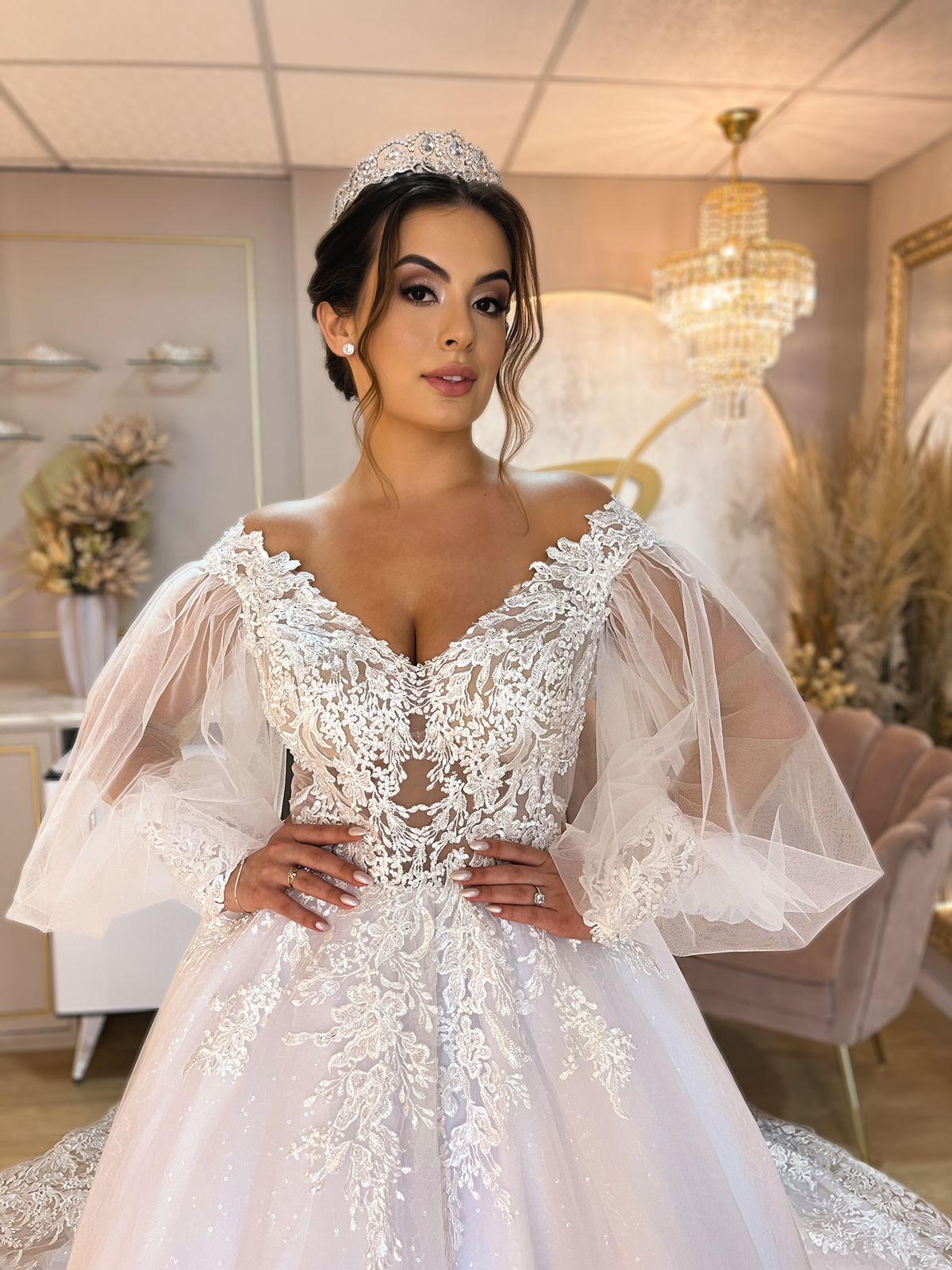 Vestido de noiva princesa, com mangas bufantes removíveis e cauda. Na Rose’s Noivas você encontra essa e outras opções de vestido de noiva.