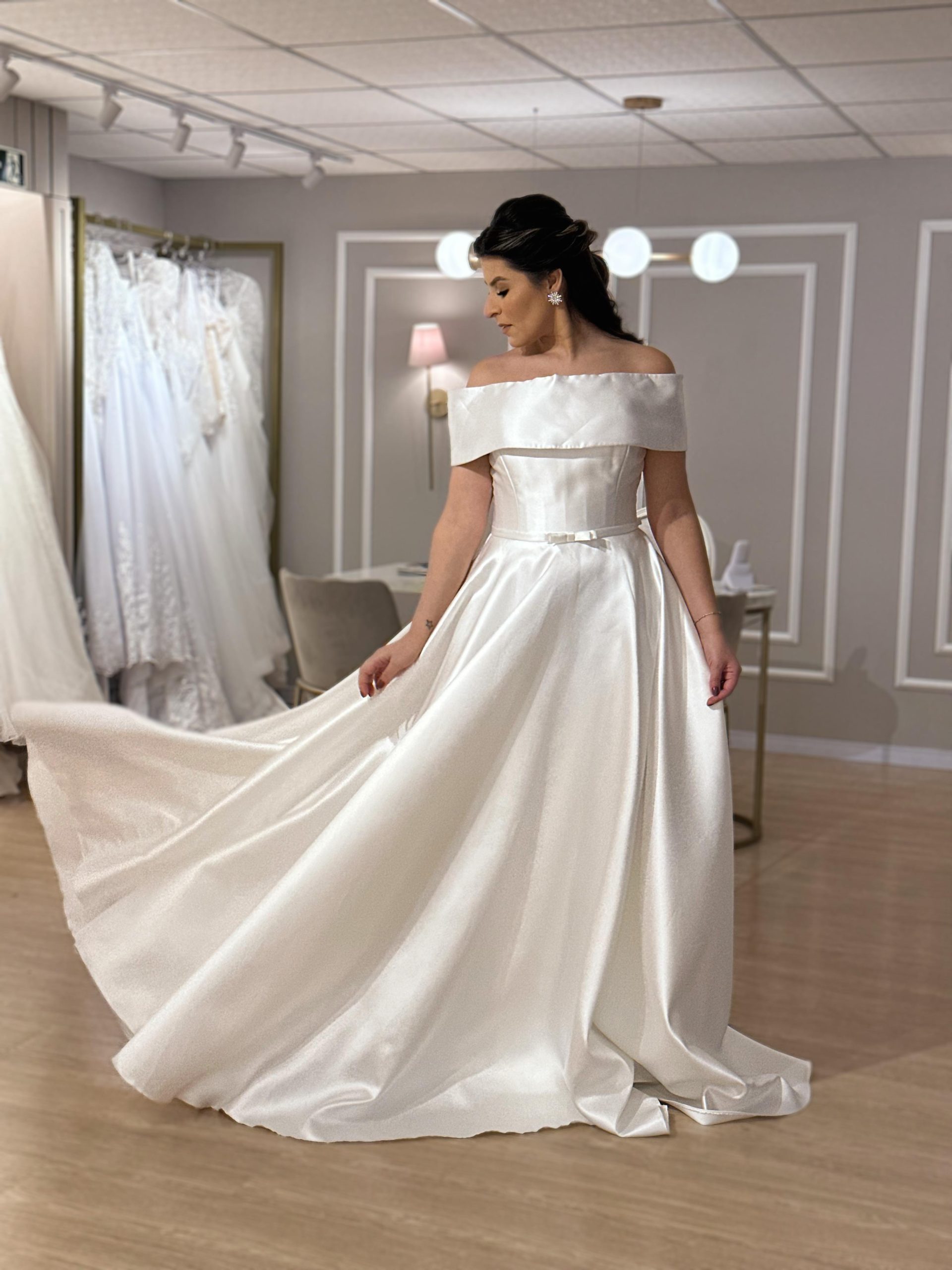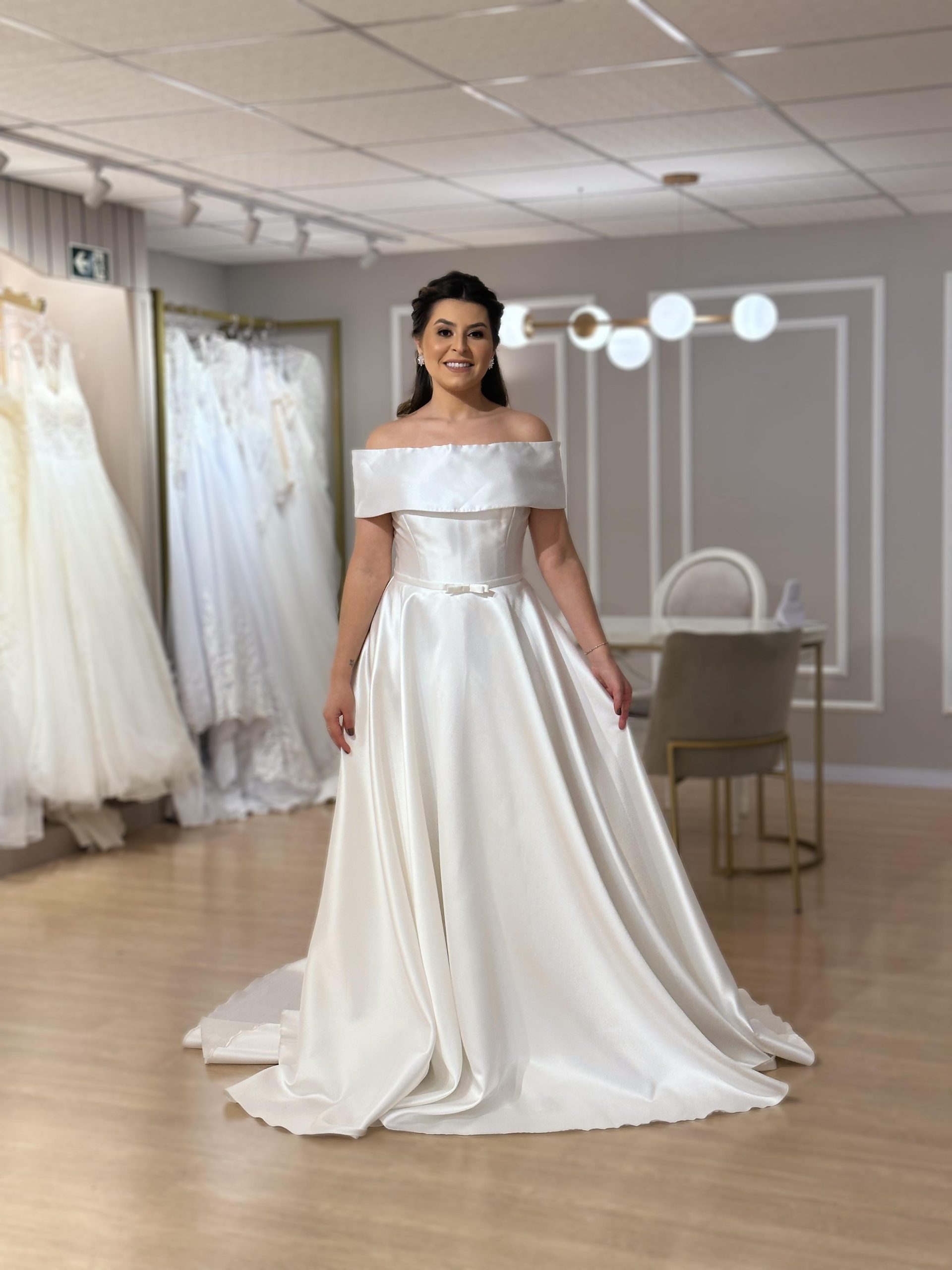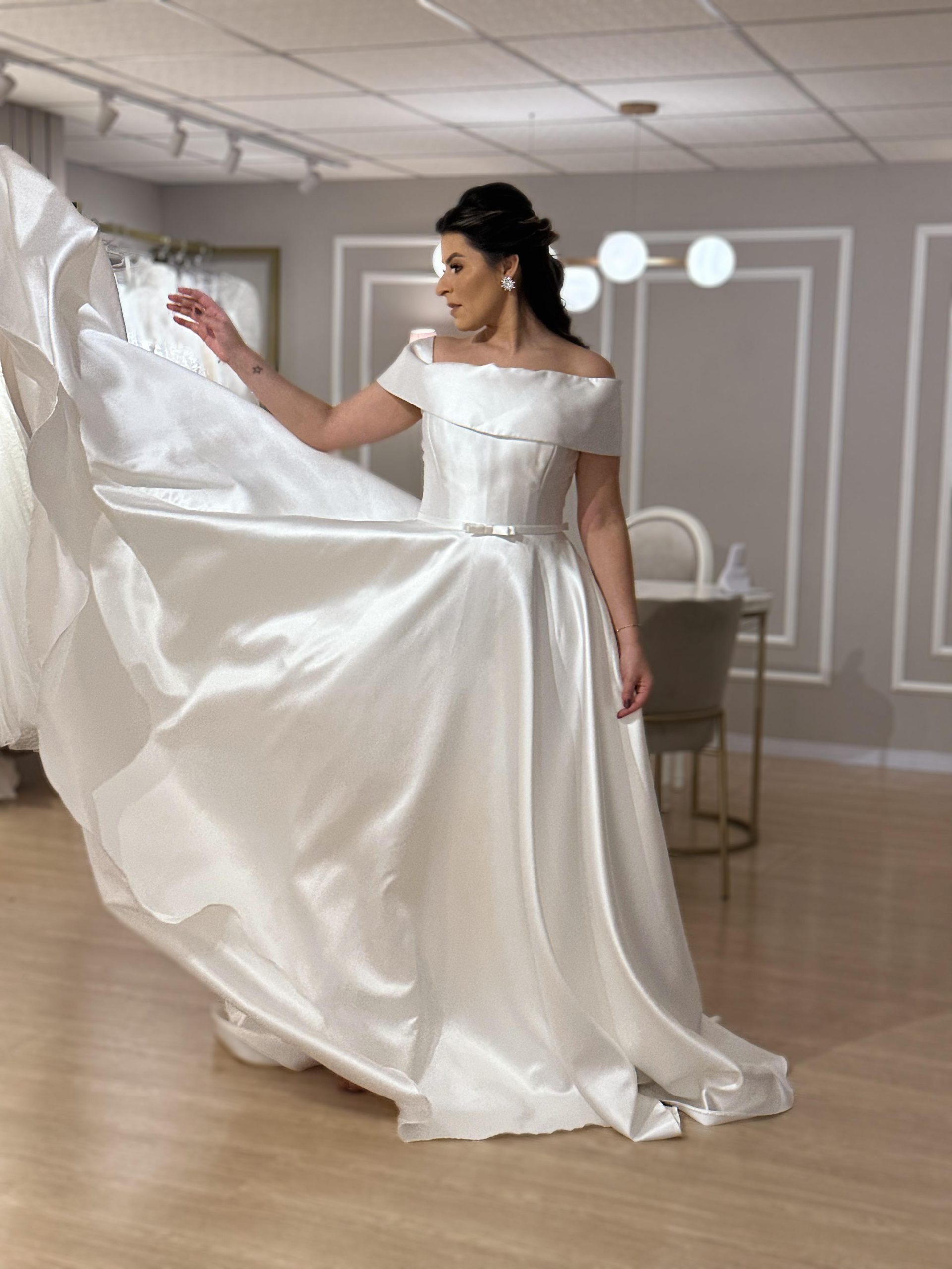 Vestido de noiva princesa, de zibeline, ombro a ombro. Opção elegante para o seu dia tão especial. Na Rose’s Noivas você encontra essa e outras opções de vestido de noiva.
