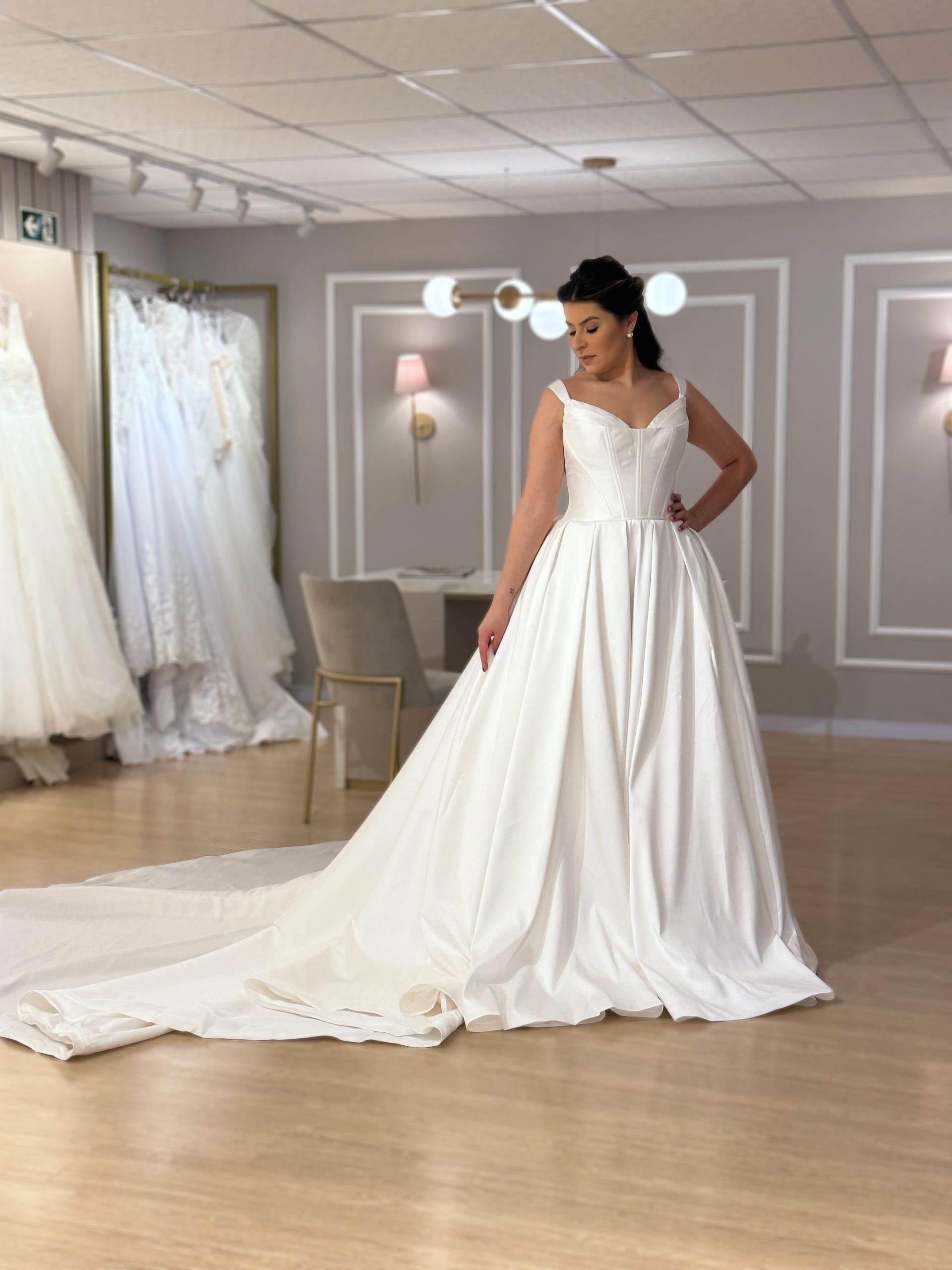 Vestido de noiva princesa, off-white, elegante e moderno, para o seu grande dia! Na Rose’s Noivas você encontra essa e outras opções de vestido de noiva.