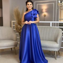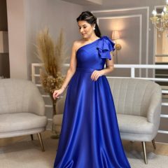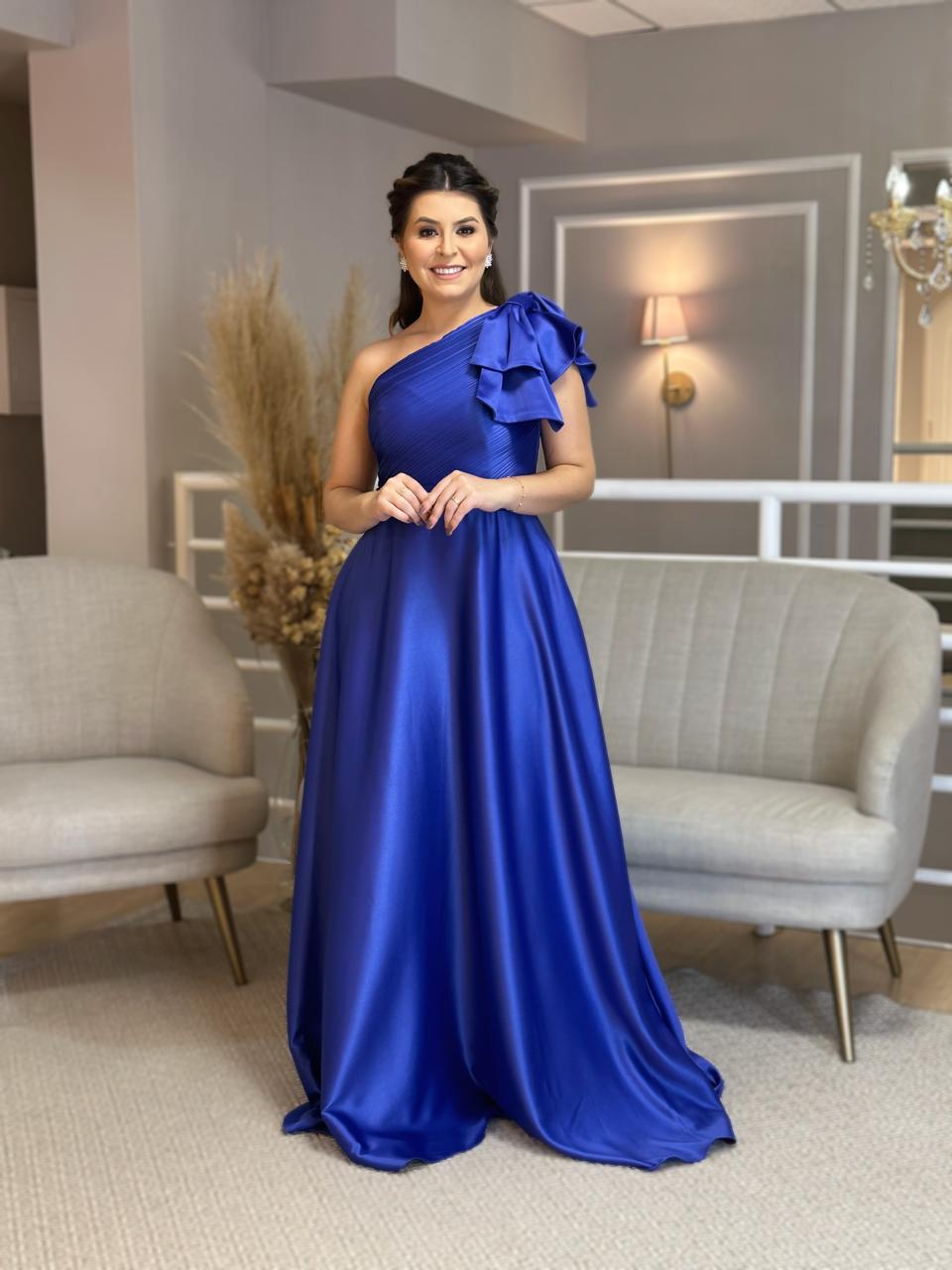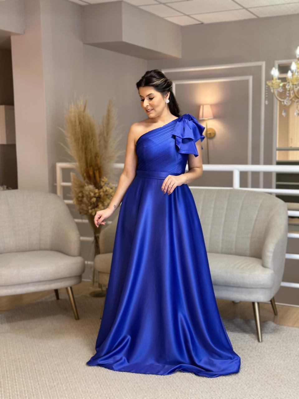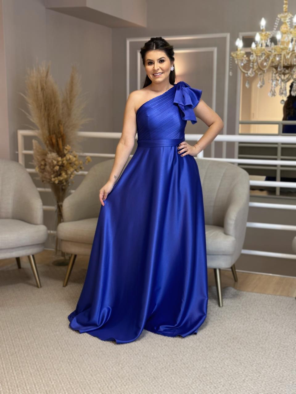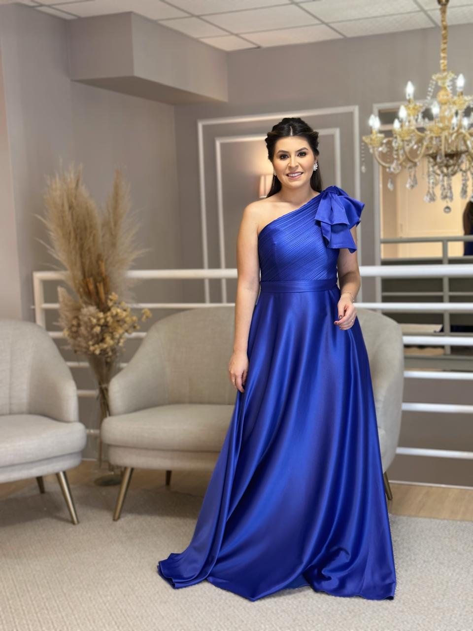 Vestido de satim, um ombro só, com a tendência de laço no ombro. Ideal para o seu evento. Na Rose’s Noivas, você encontra uma ampla variedade de modelos e tamanhos. Agende o seu horário e venha conferir!