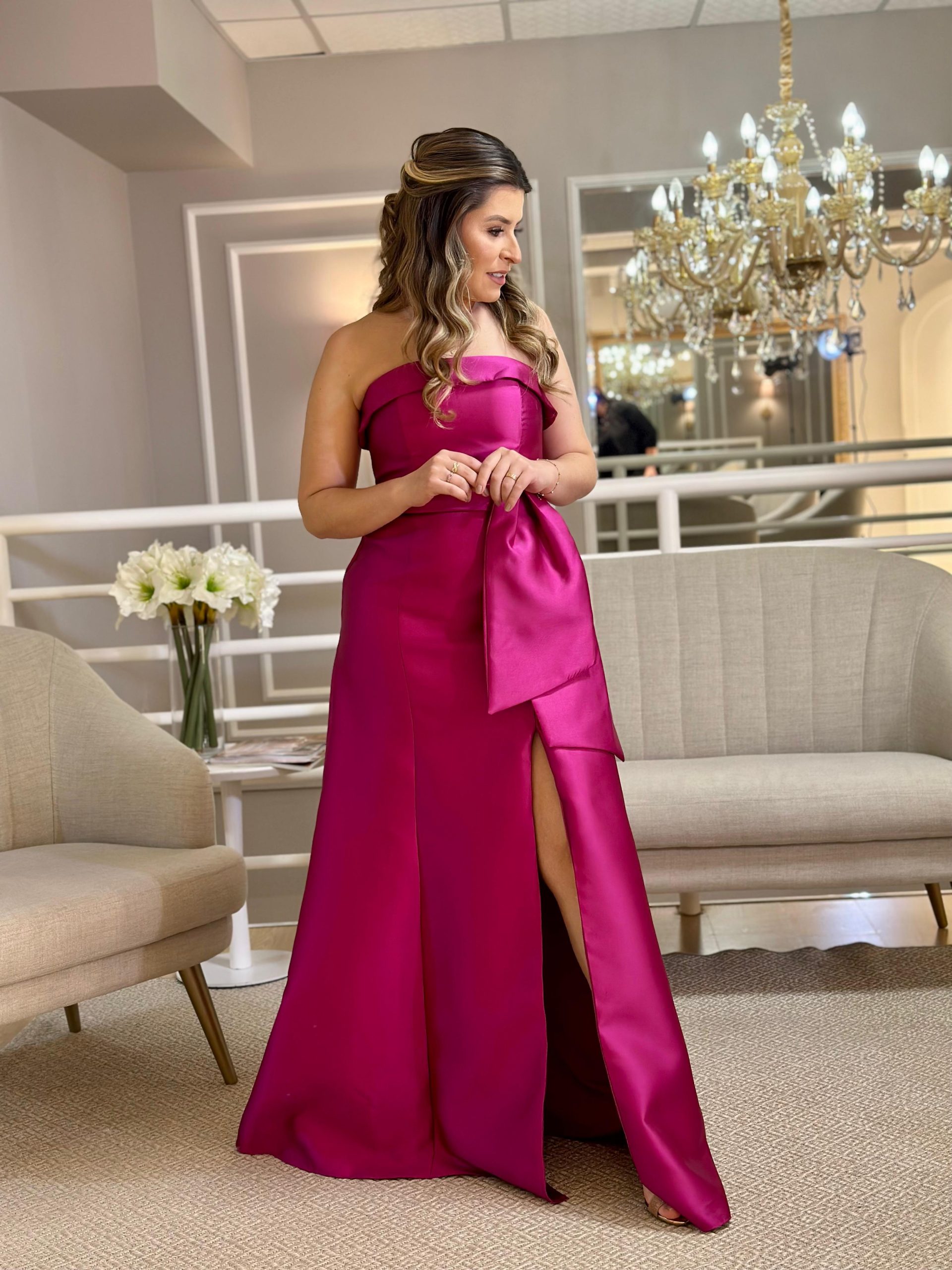 Vestido rosa de zibeline, moderno, com fenda. Na Rose’s Noivas, você encontra uma ampla variedade de modelos e tamanhos. Agende o seu horário e venha conferir!