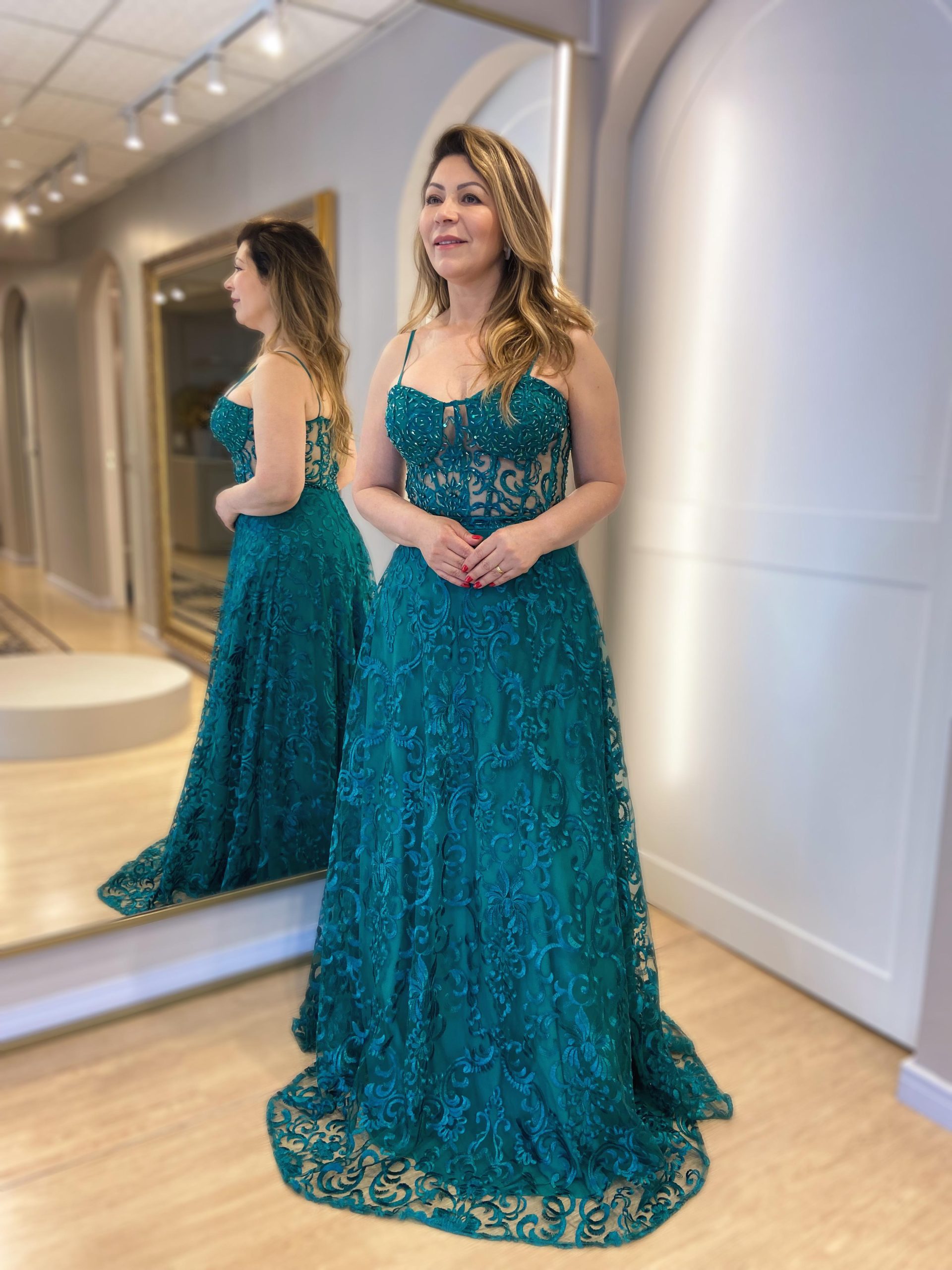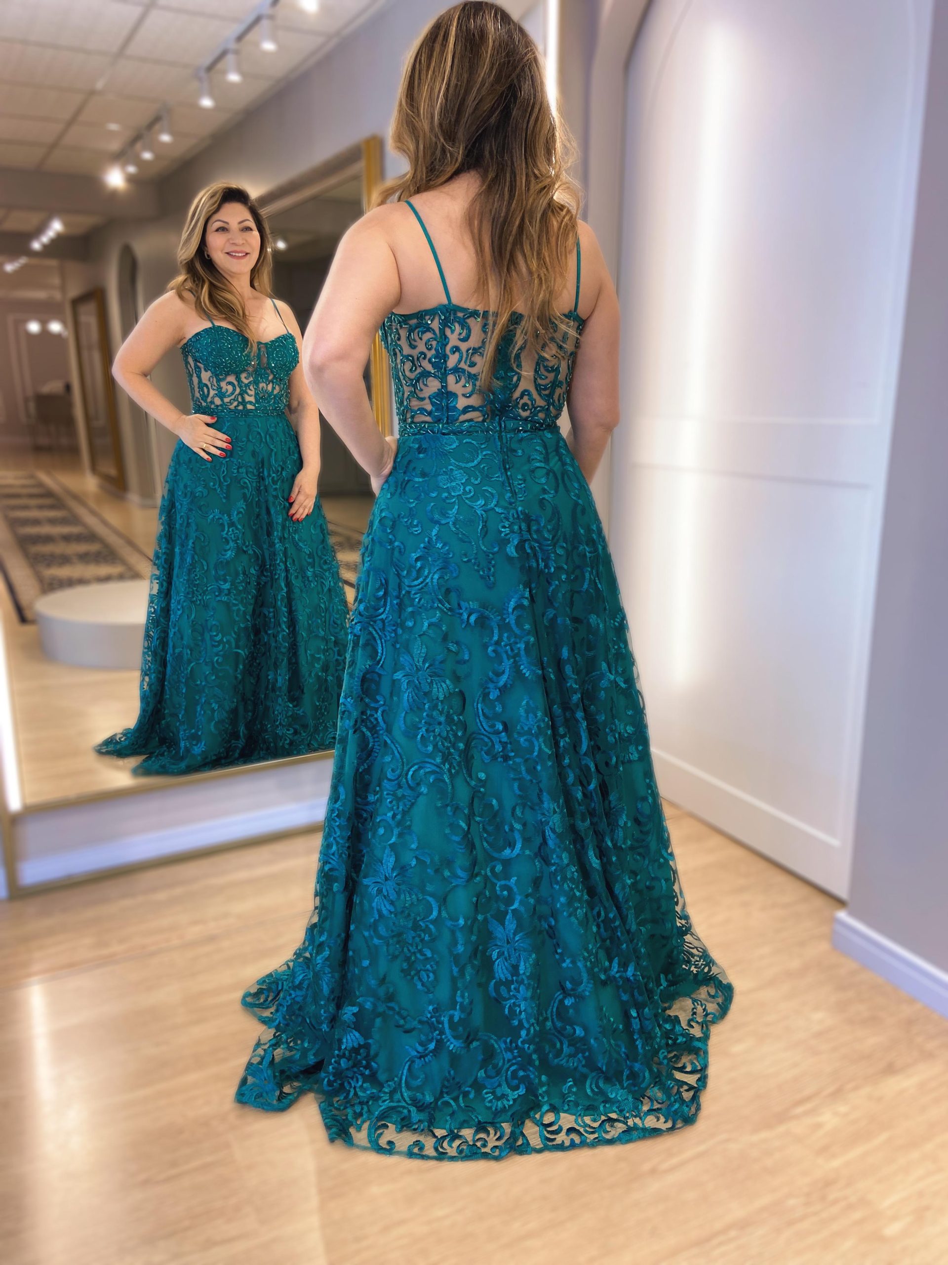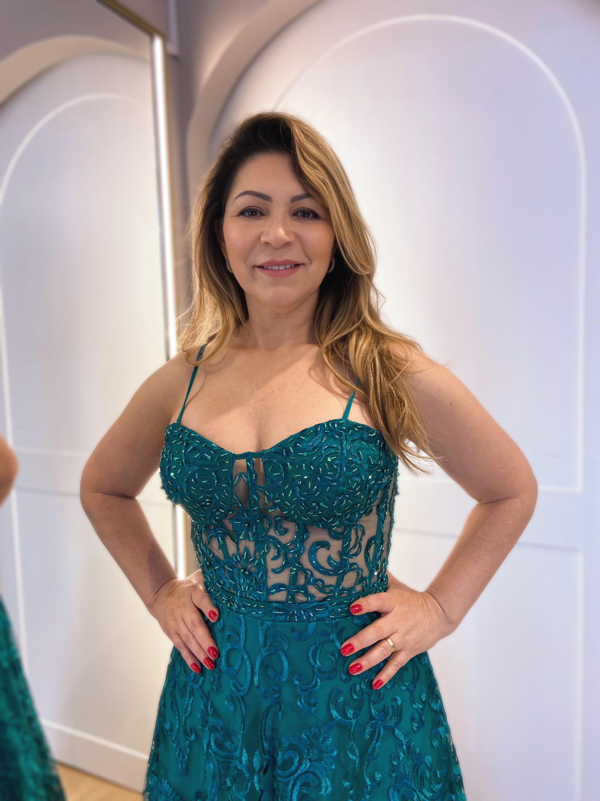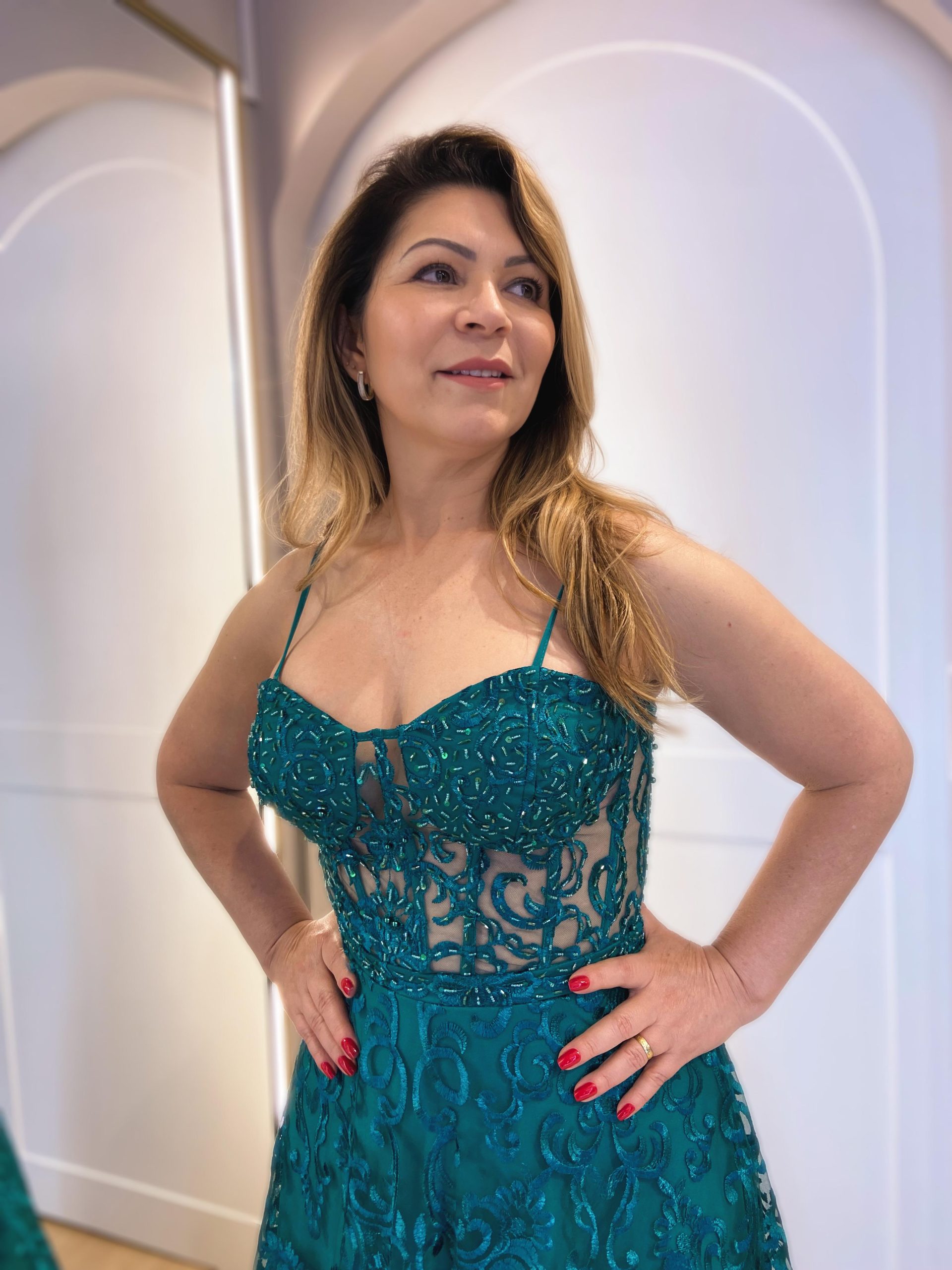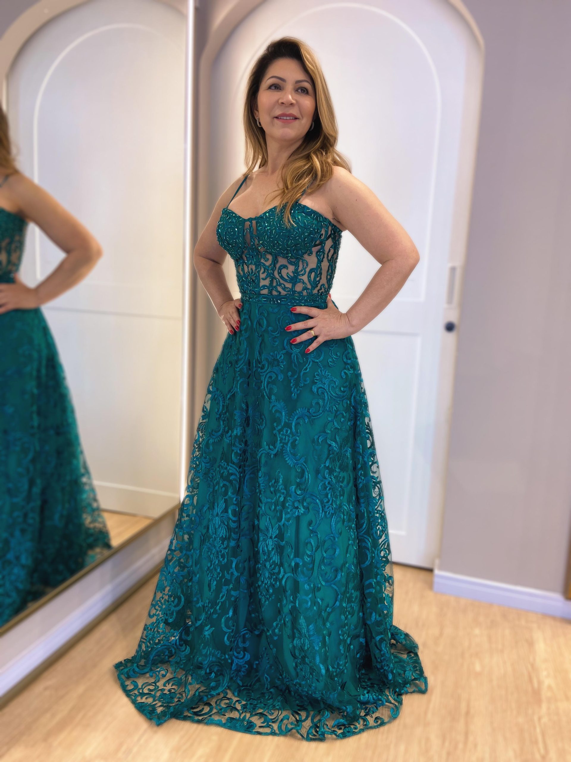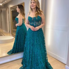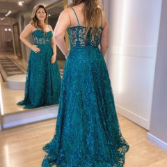 Vestido de corselet, todo bordado, incrível para o seu evento! Na Rose’s Noivas, você encontra uma ampla variedade de modelos e tamanhos. Agende o seu horário e venha conferir!